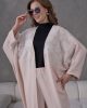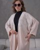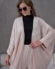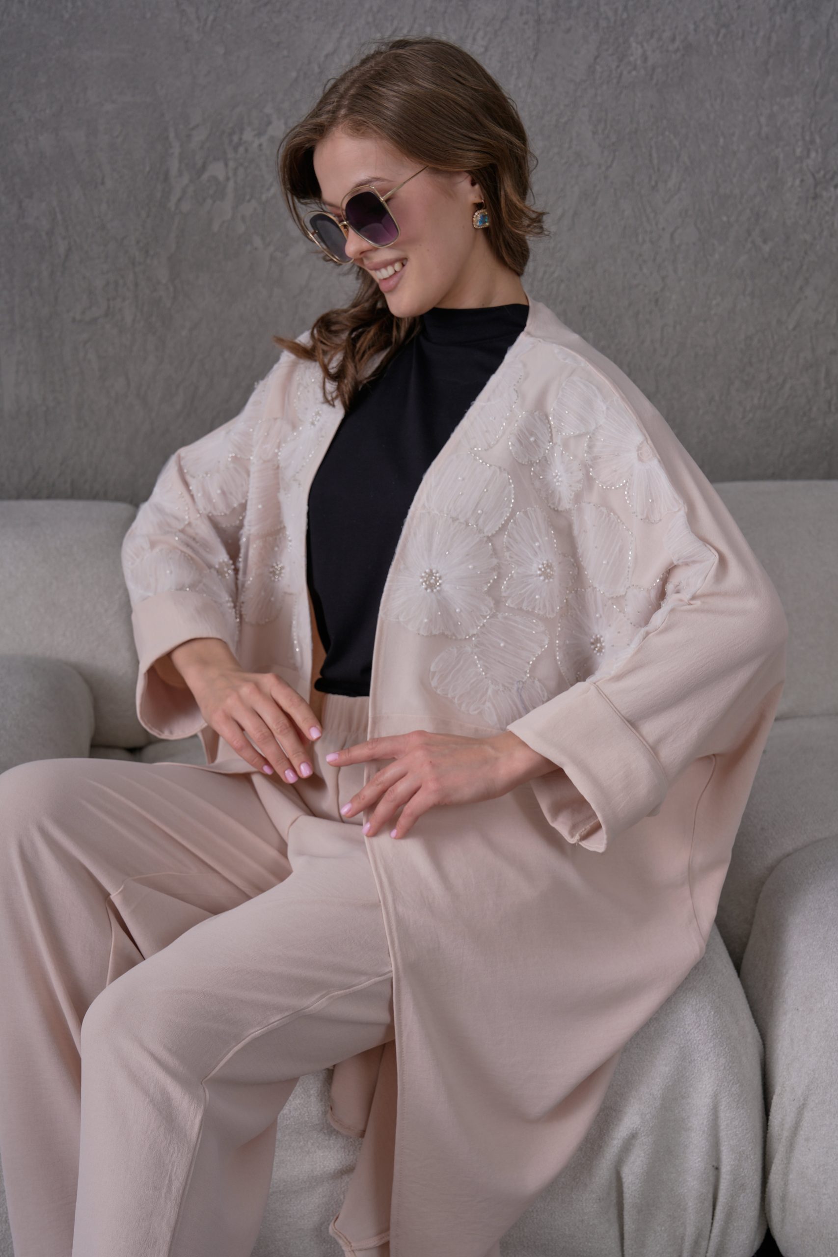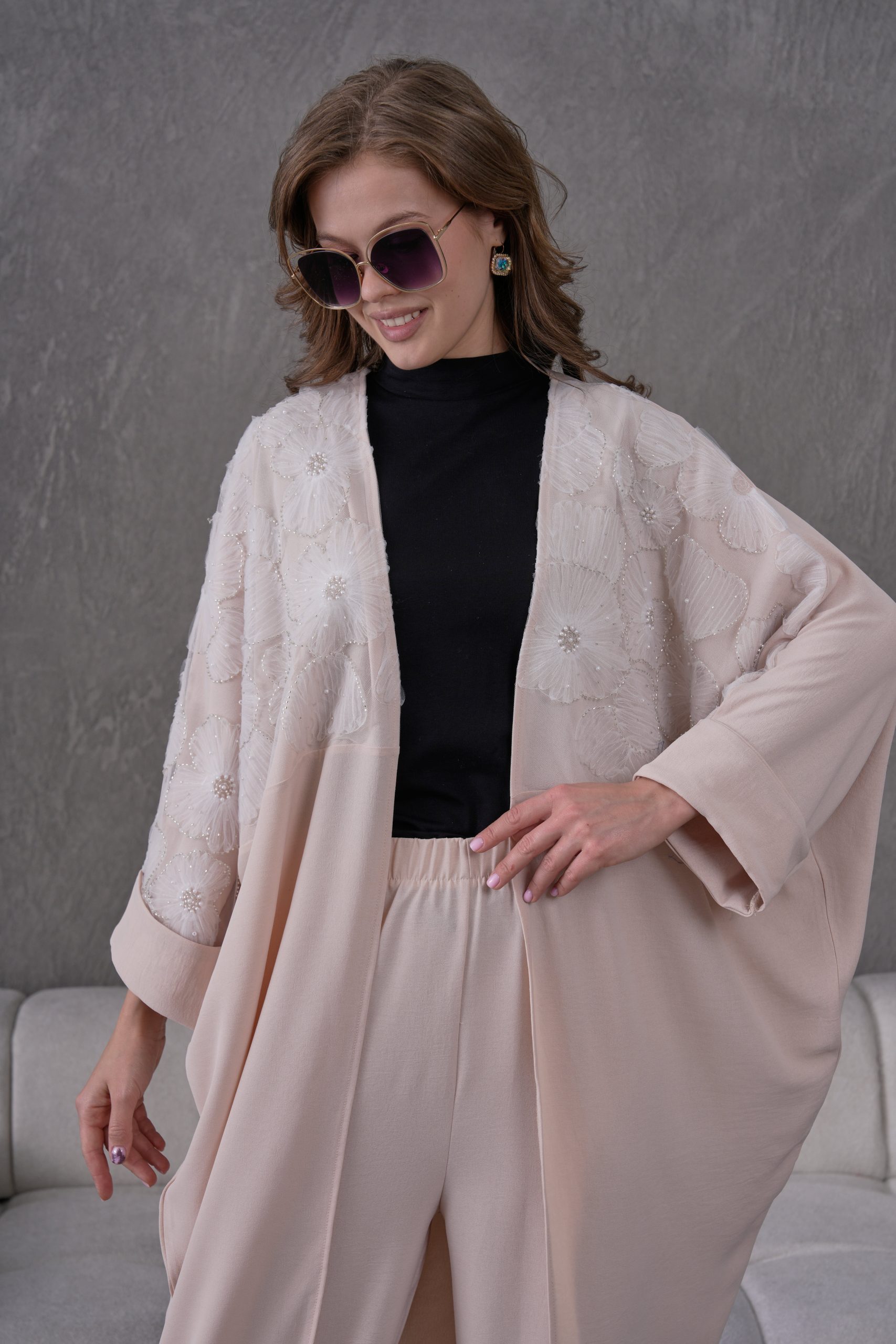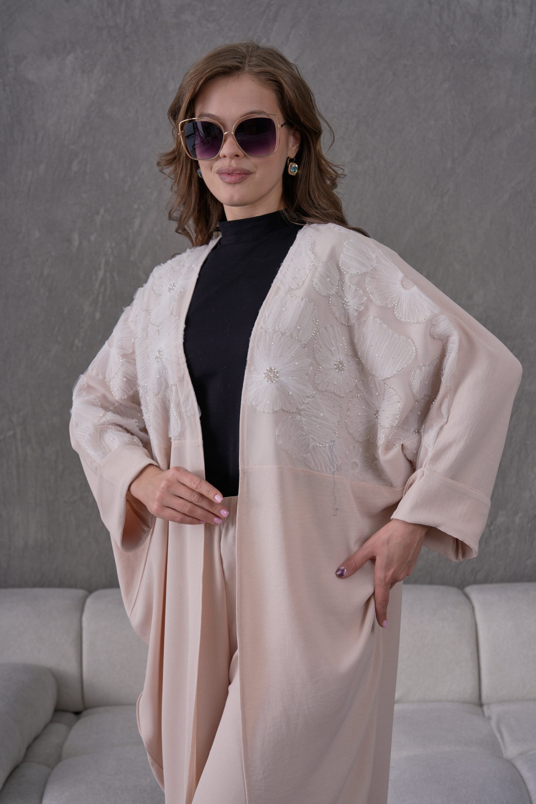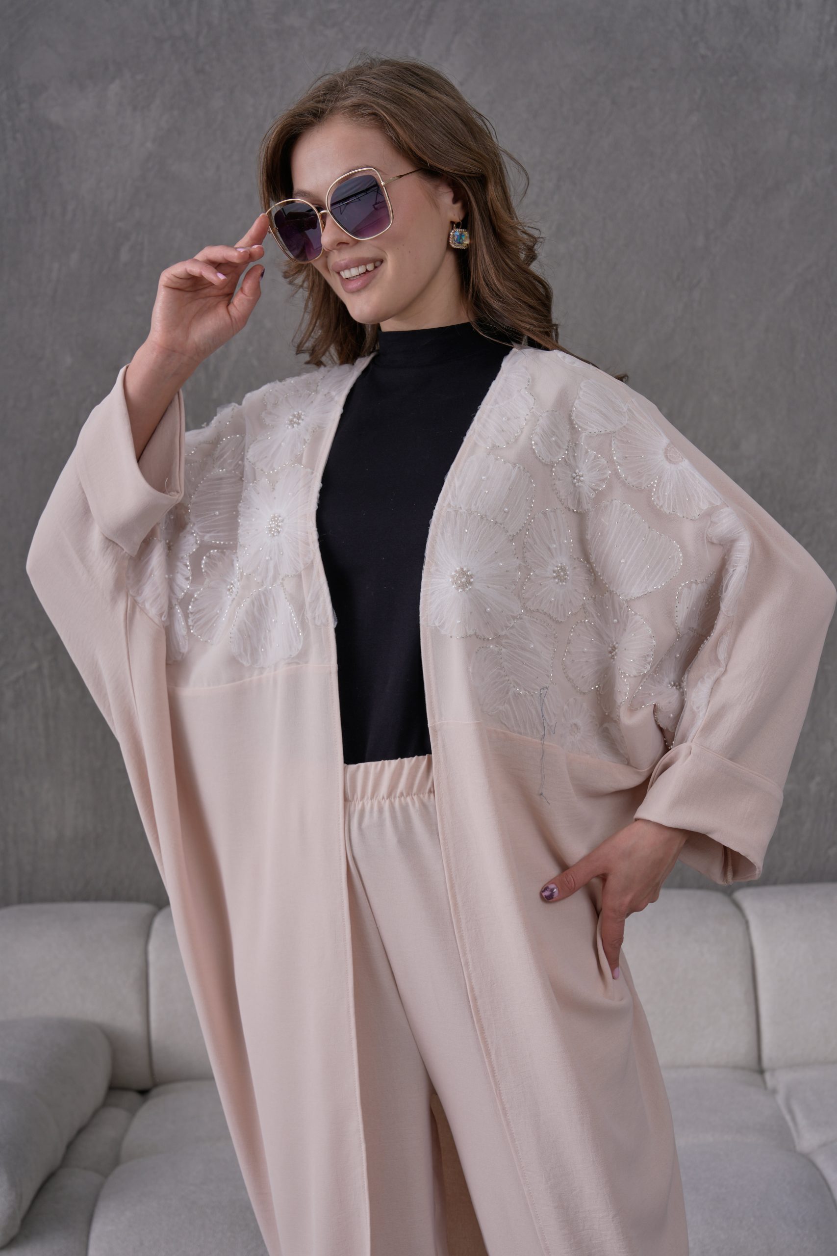 Zanaatkar Boncuk Nakışları: Kimono hırkanın ön panelleri boyunca uzanan floral nakışlar ve zarif boncuk işlemeleri, doğal keten dokusuna sofistike ve lüks bir hava katar.