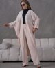 Asimetrik Kimono Kesimi: Kimononun ön kısımdaki kavisli yırtmaç detayları ve uzun dökümlü formu, tasarıma modern bir dinamizm kazandırır.