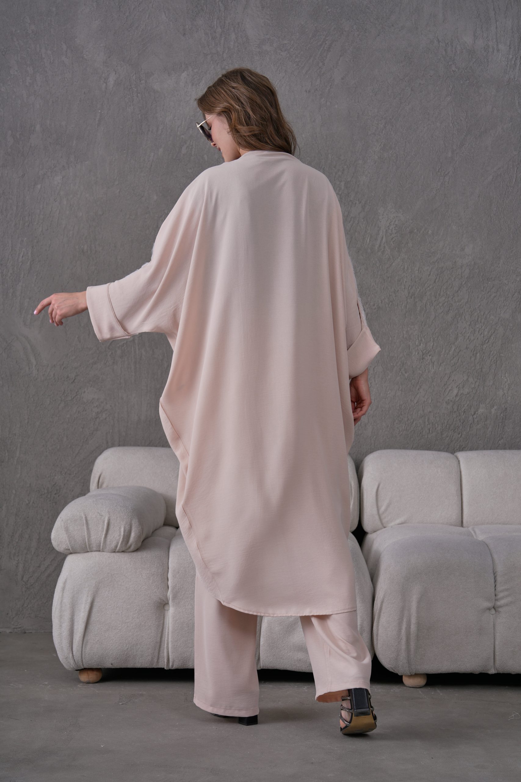 Konforlu Geniş Paça Pantolon: Takımın alt parçası, beli lastikli yapısı ile gün boyu rahatlık sunarken, bol paça kesimiyle tesettür giyimin zarafetini yansıtır.