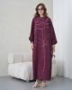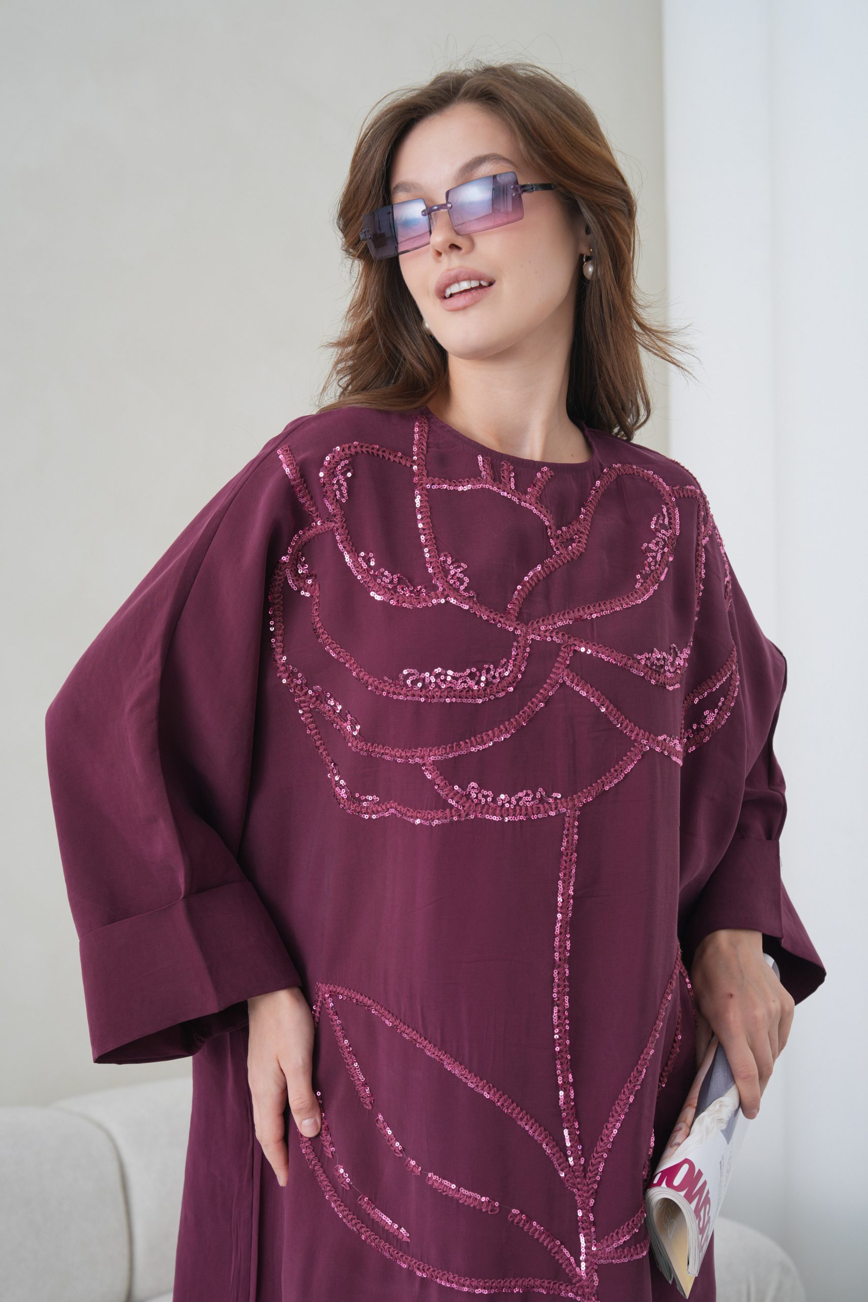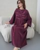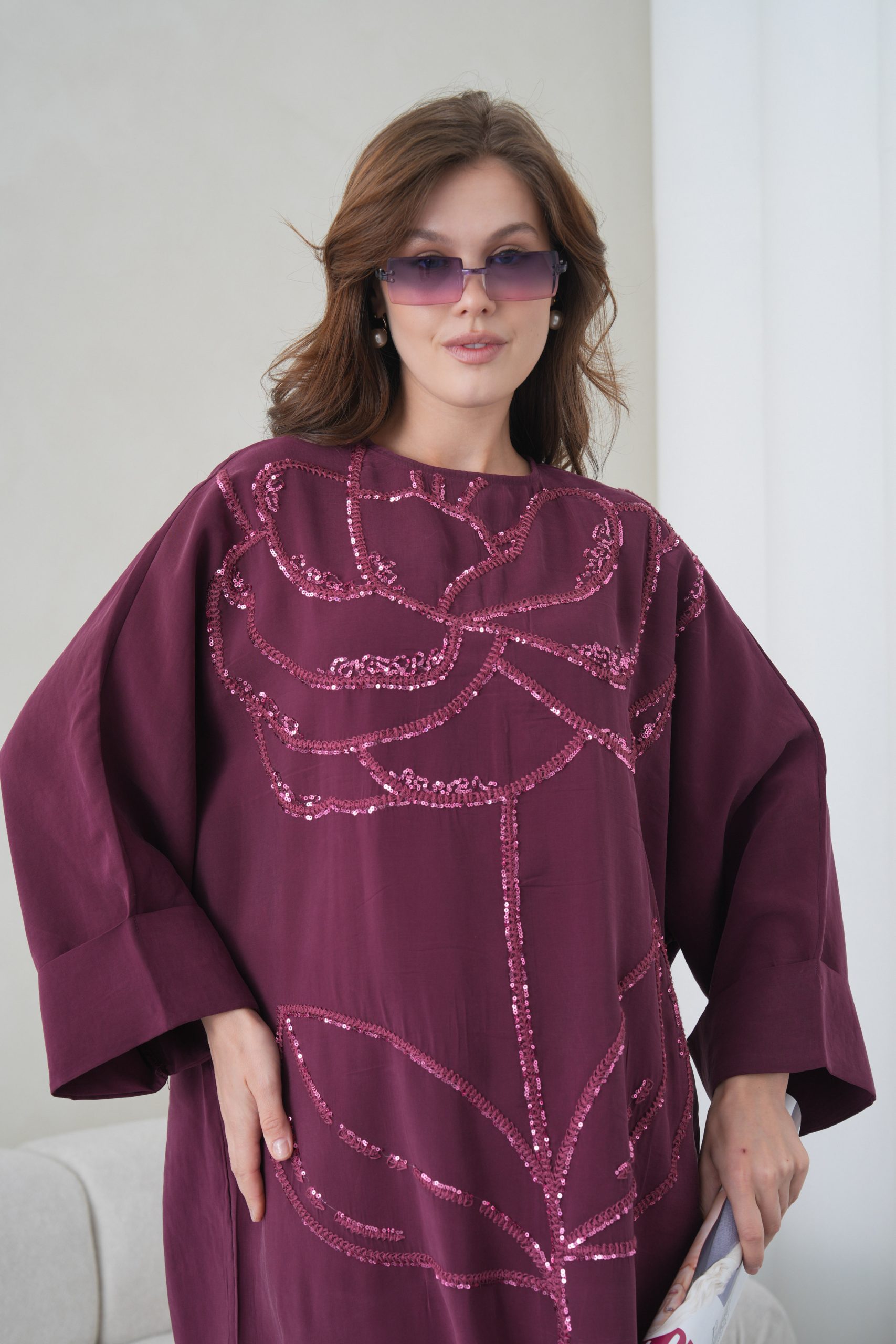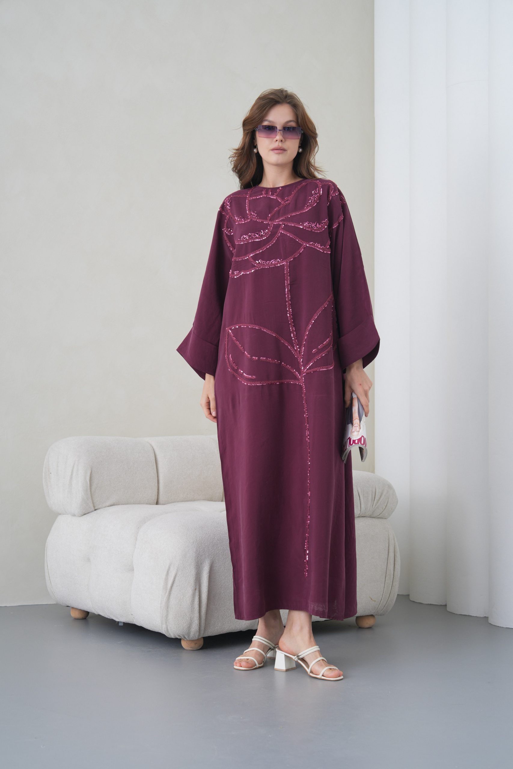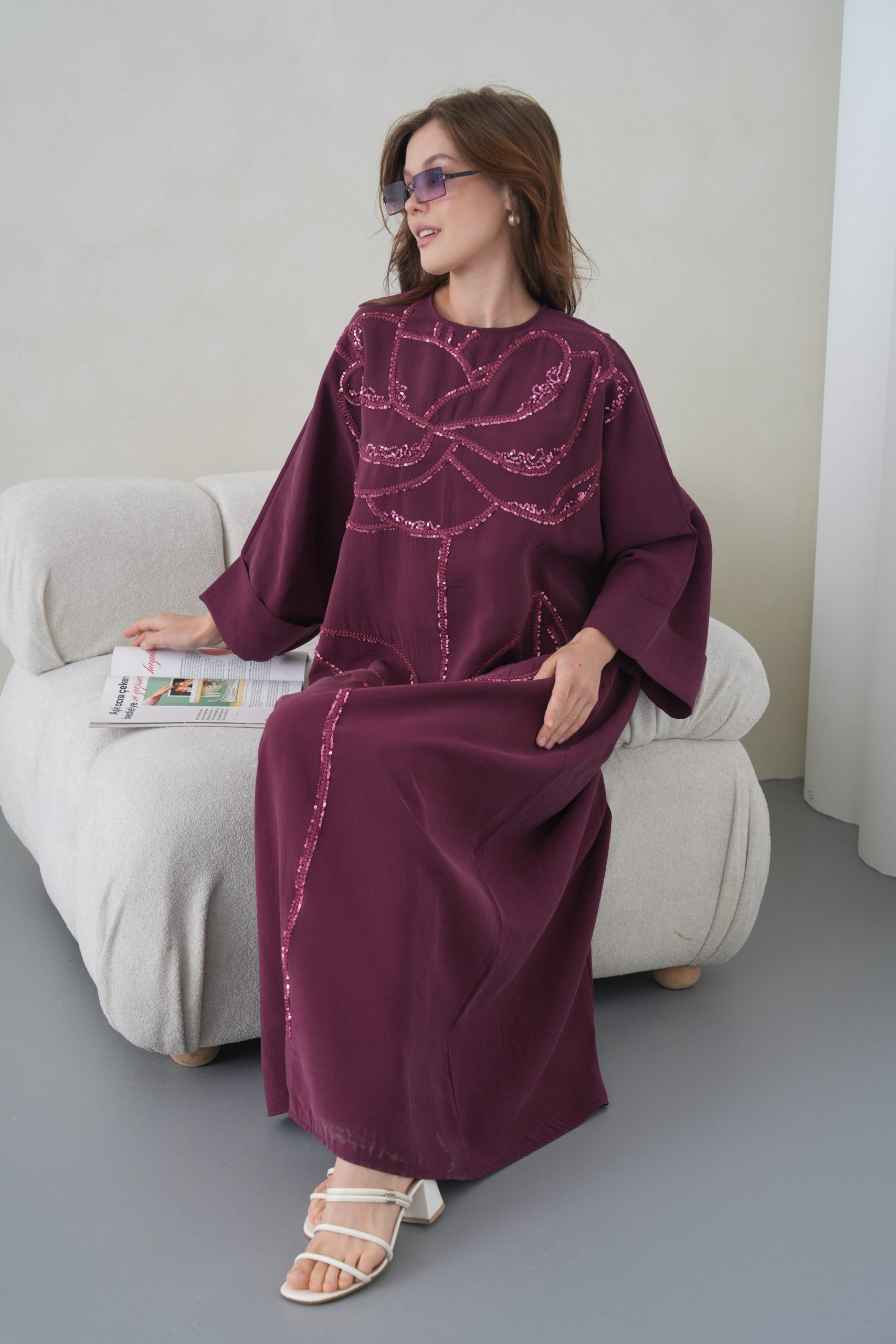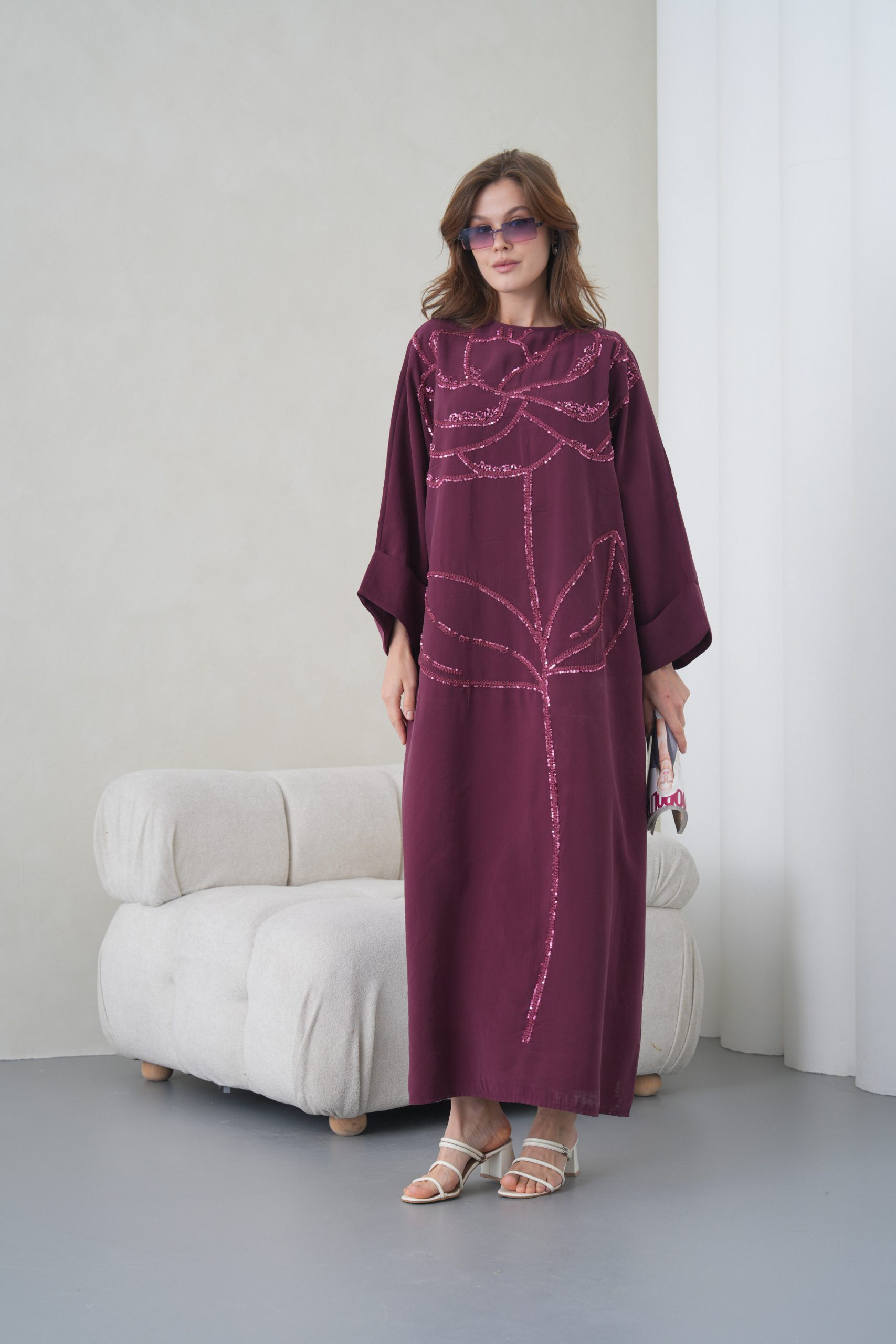 Asimetrik Kimono Kesimi: Elbisenin ön kısımdaki işleme detayları ve uzun dökümlü formu, tasarıma modern bir dinamizm kazandırır.