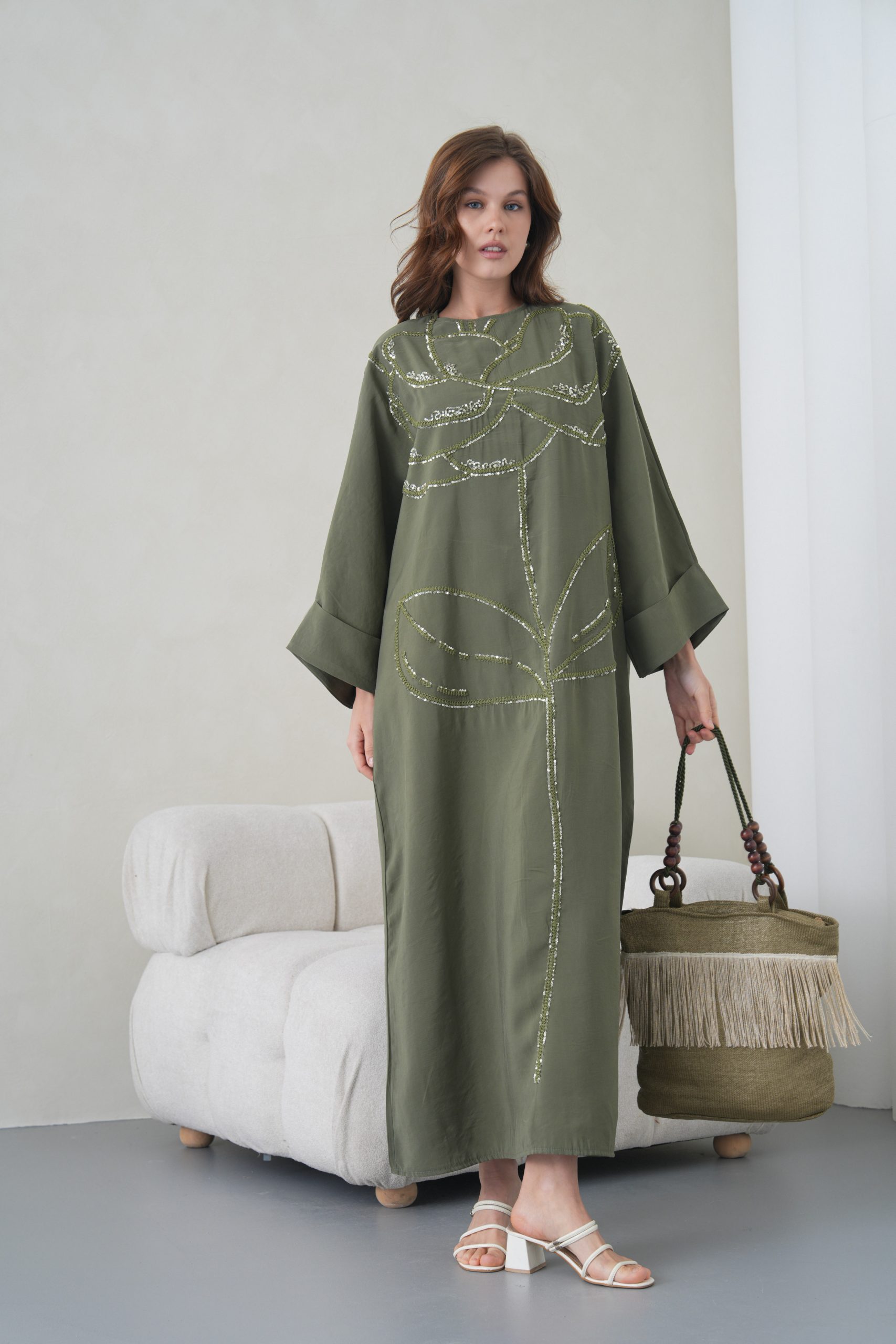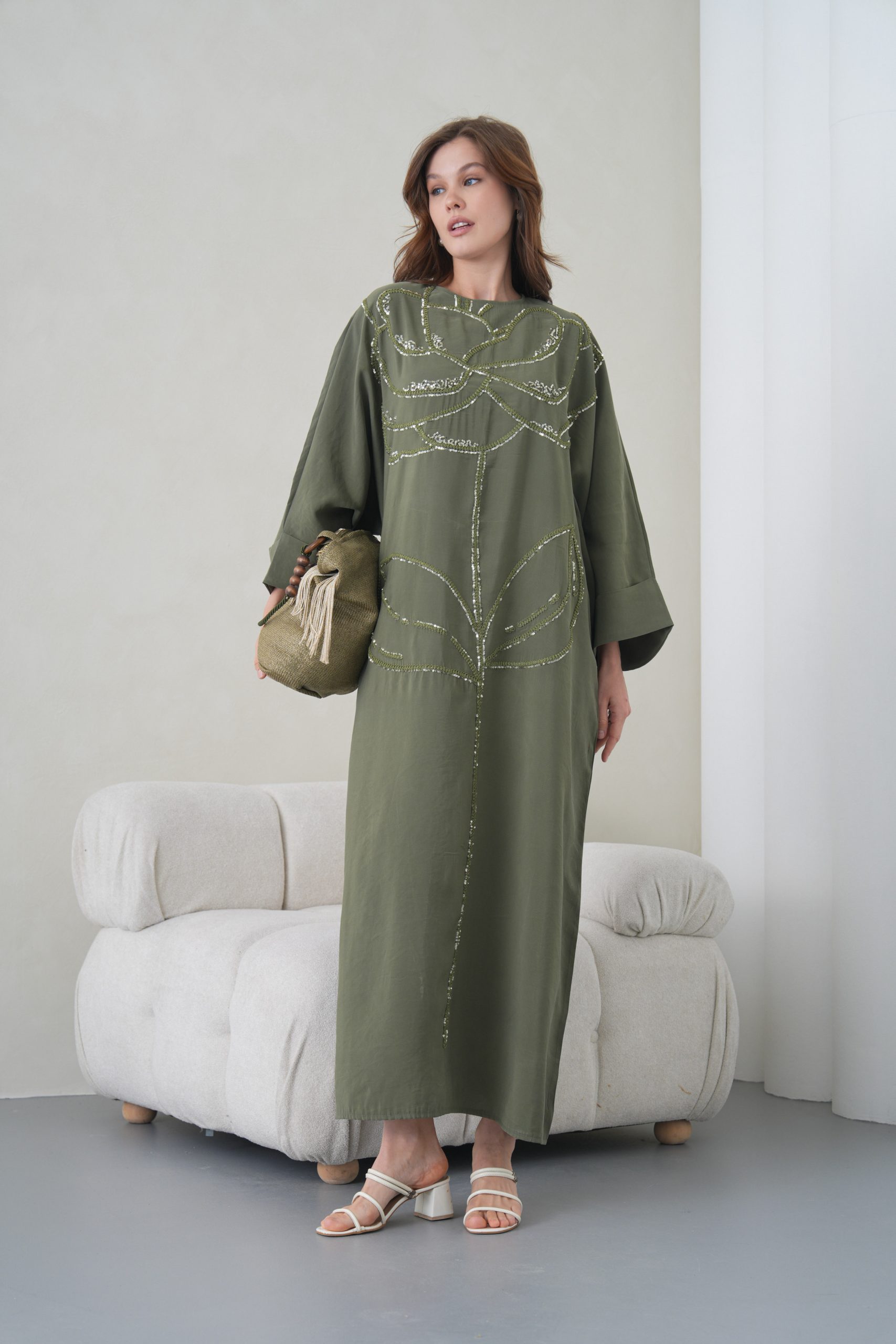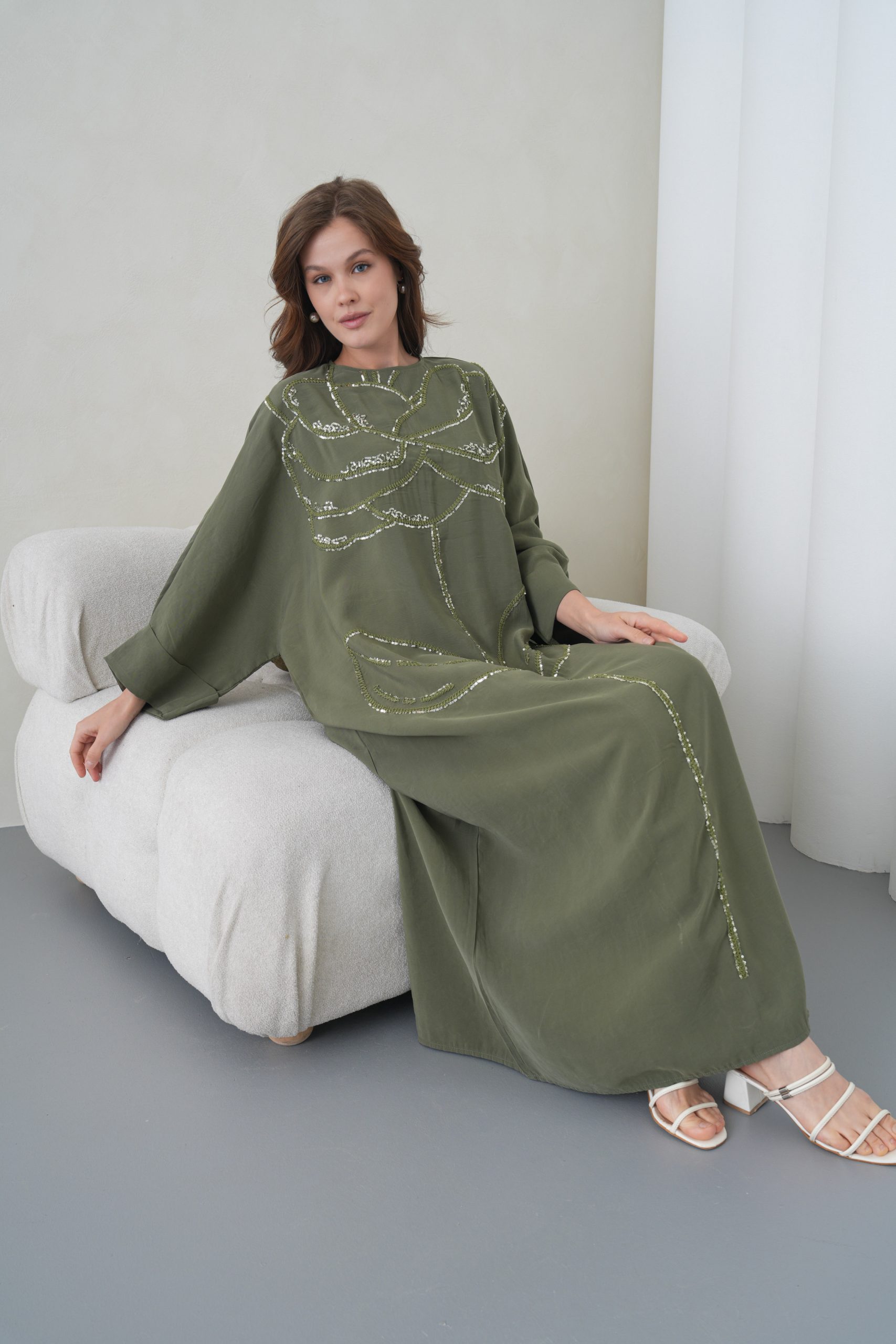 Asimetrik Kimono Kesimi: Elbisenin ön kısımdaki işleme detayları ve uzun dökümlü formu, tasarıma modern bir dinamizm kazandırır.