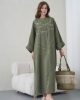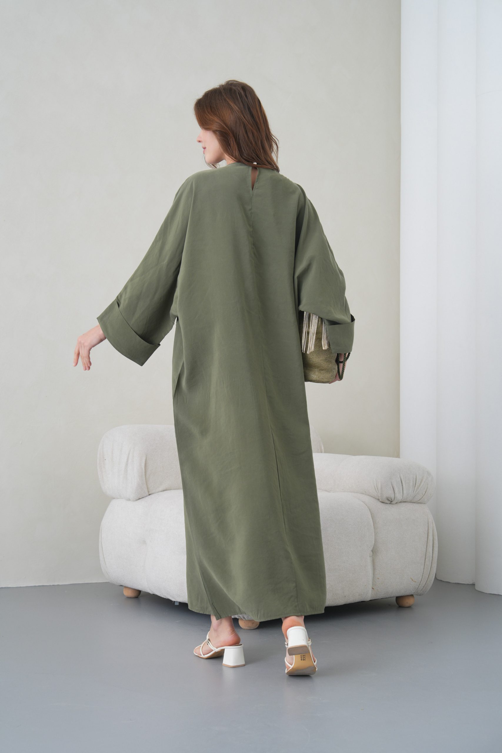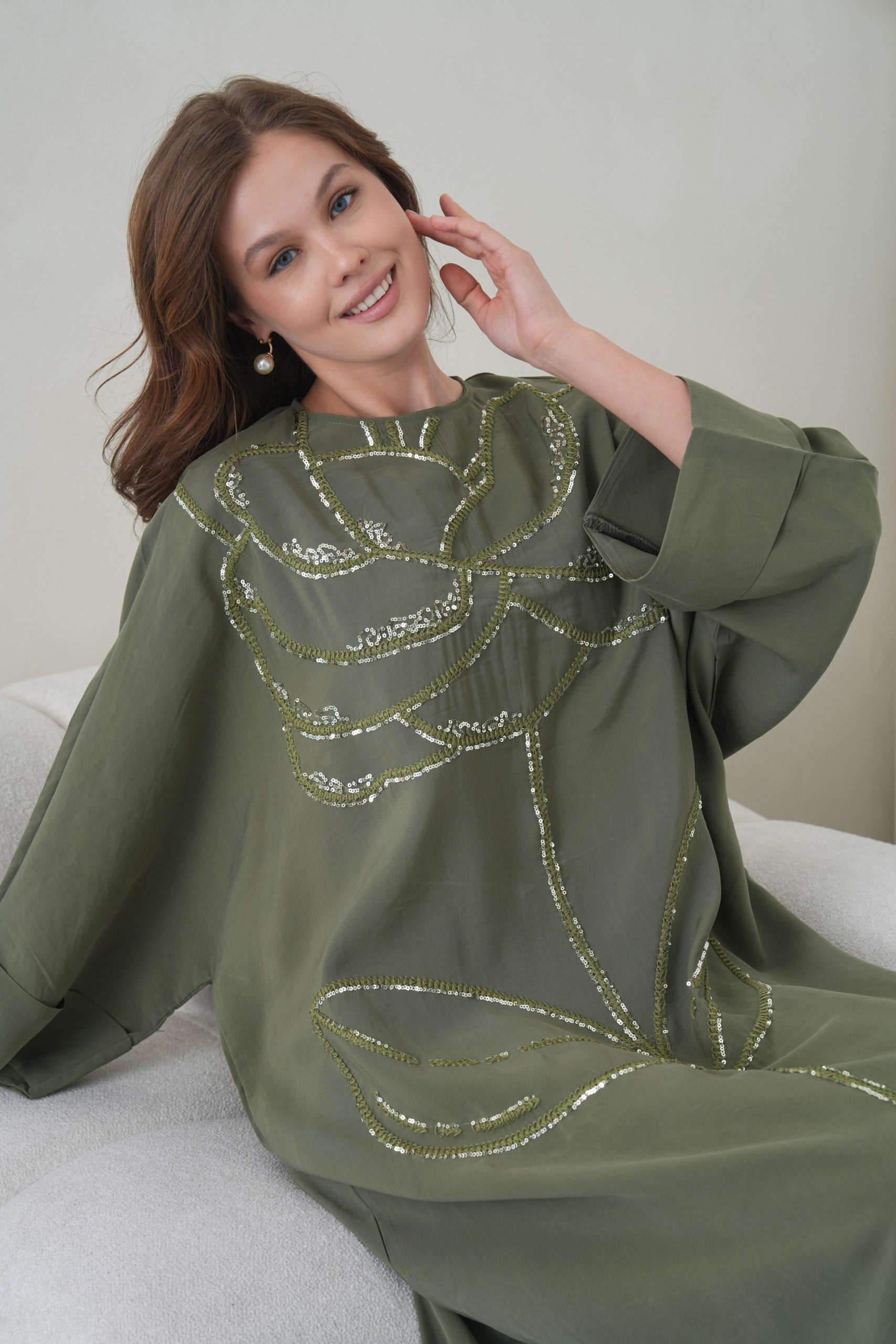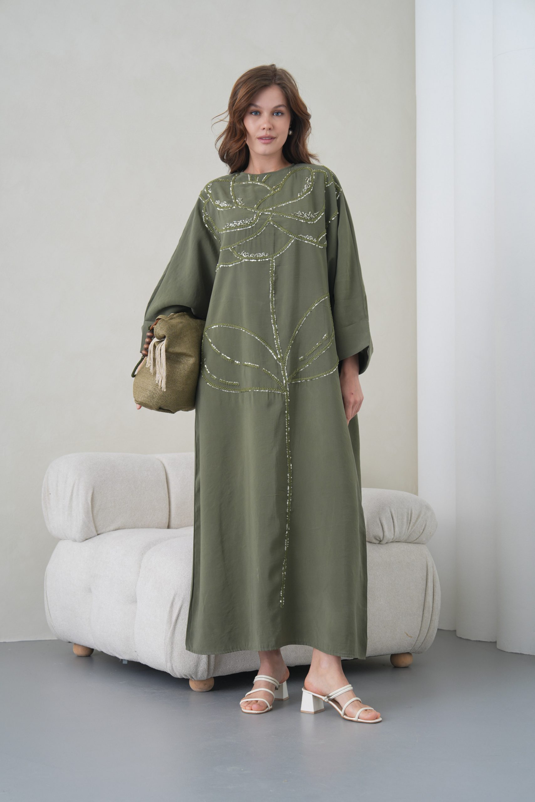 Asimetrik Kimono Kesimi: Elbisenin ön kısımdaki işleme detayları ve uzun dökümlü formu, tasarıma modern bir dinamizm kazandırır.