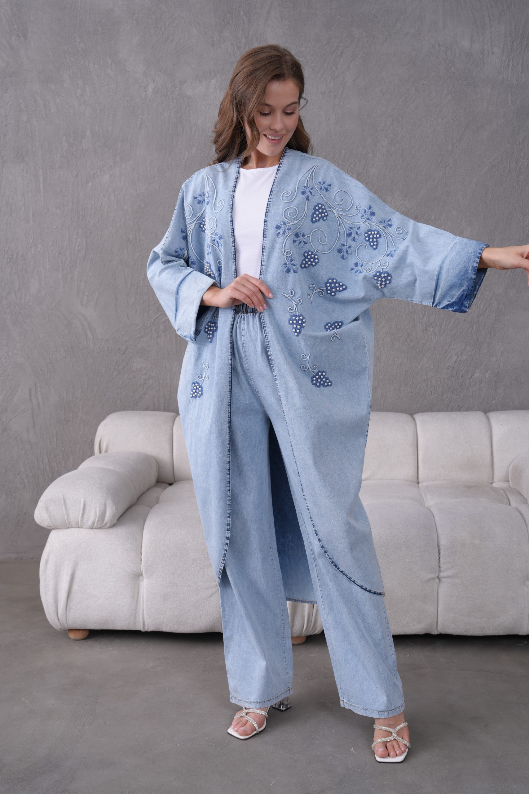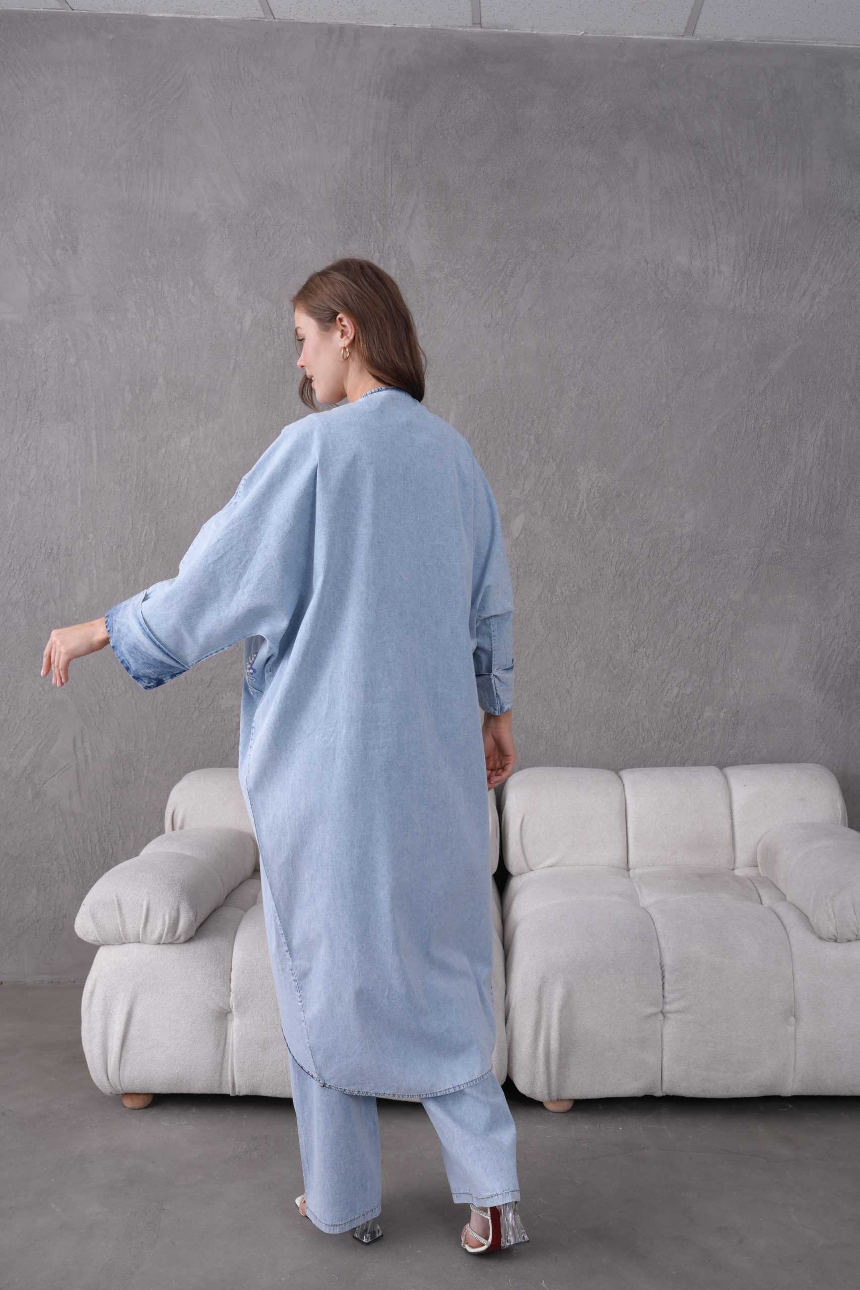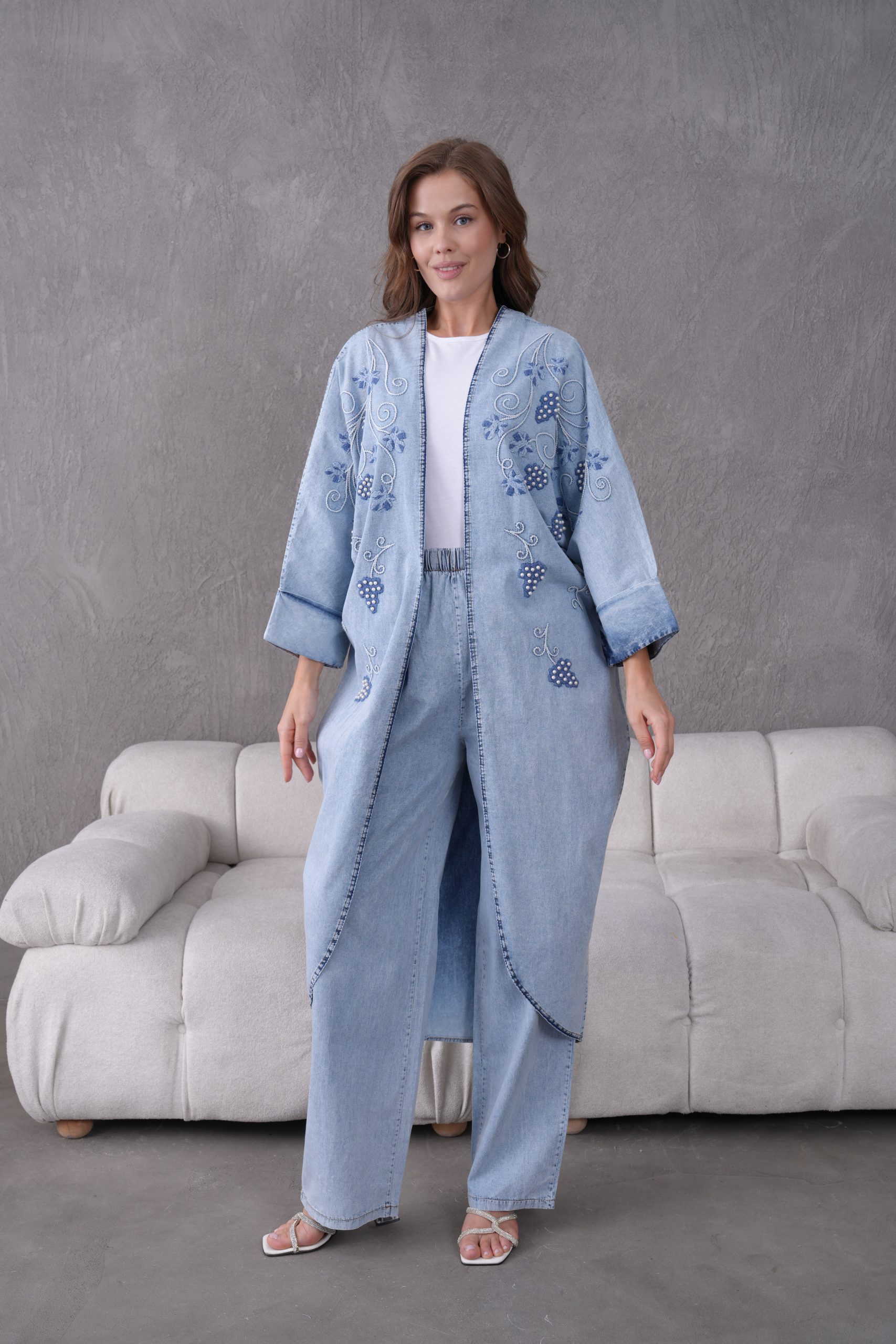 Denimin zamansız ve güçlü duruşu, usta işi boncuk nakışları ve modern kesimlerle yeniden yorumlanıyor. ELORA’nın muhafazakar giyim standartlarını estetik bir vizyonla buluşturduğu bu ikili takım; hem günlük şıklığınızda hem de özel davetlerde gardırobunuzun en iddialı parçası olacak.