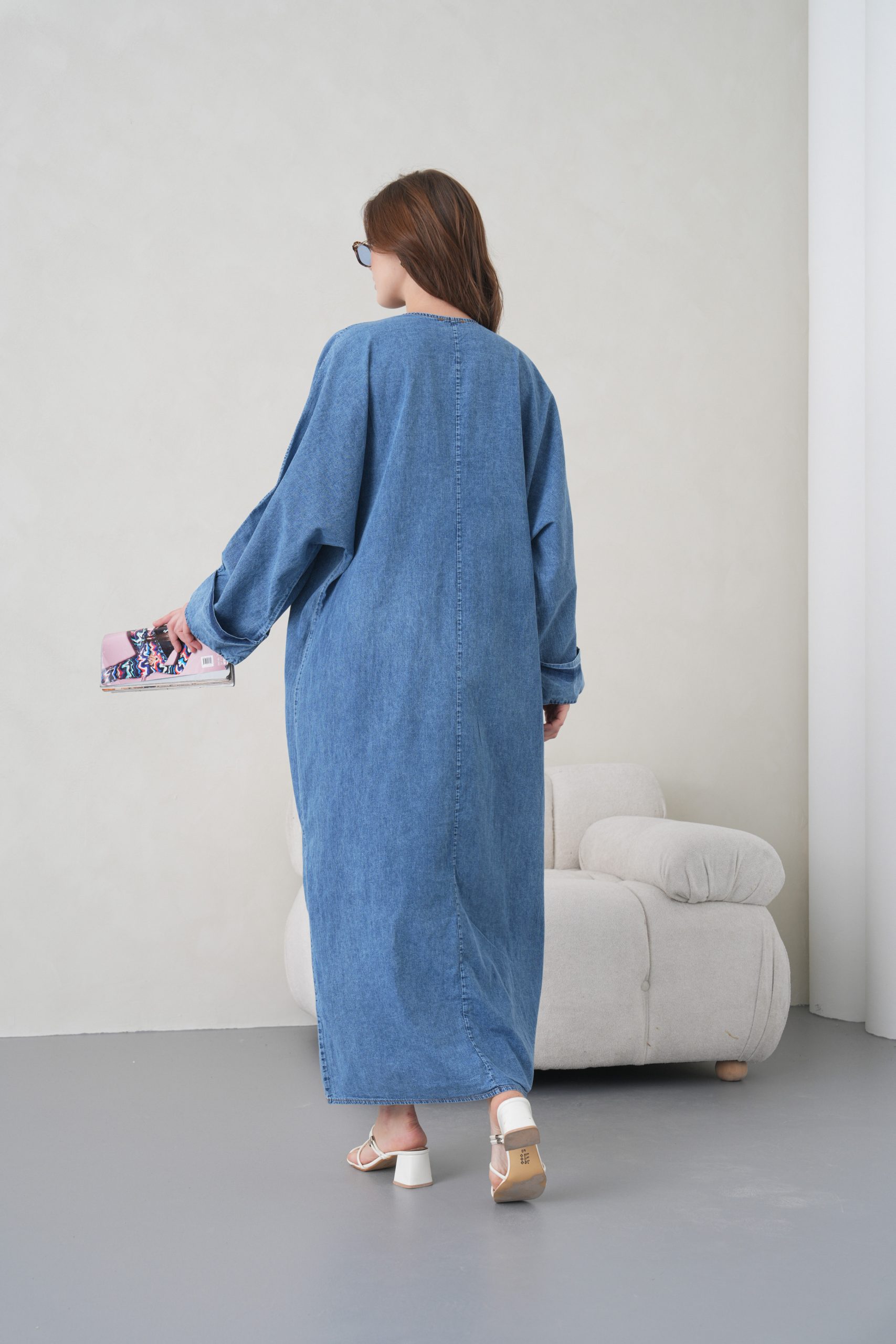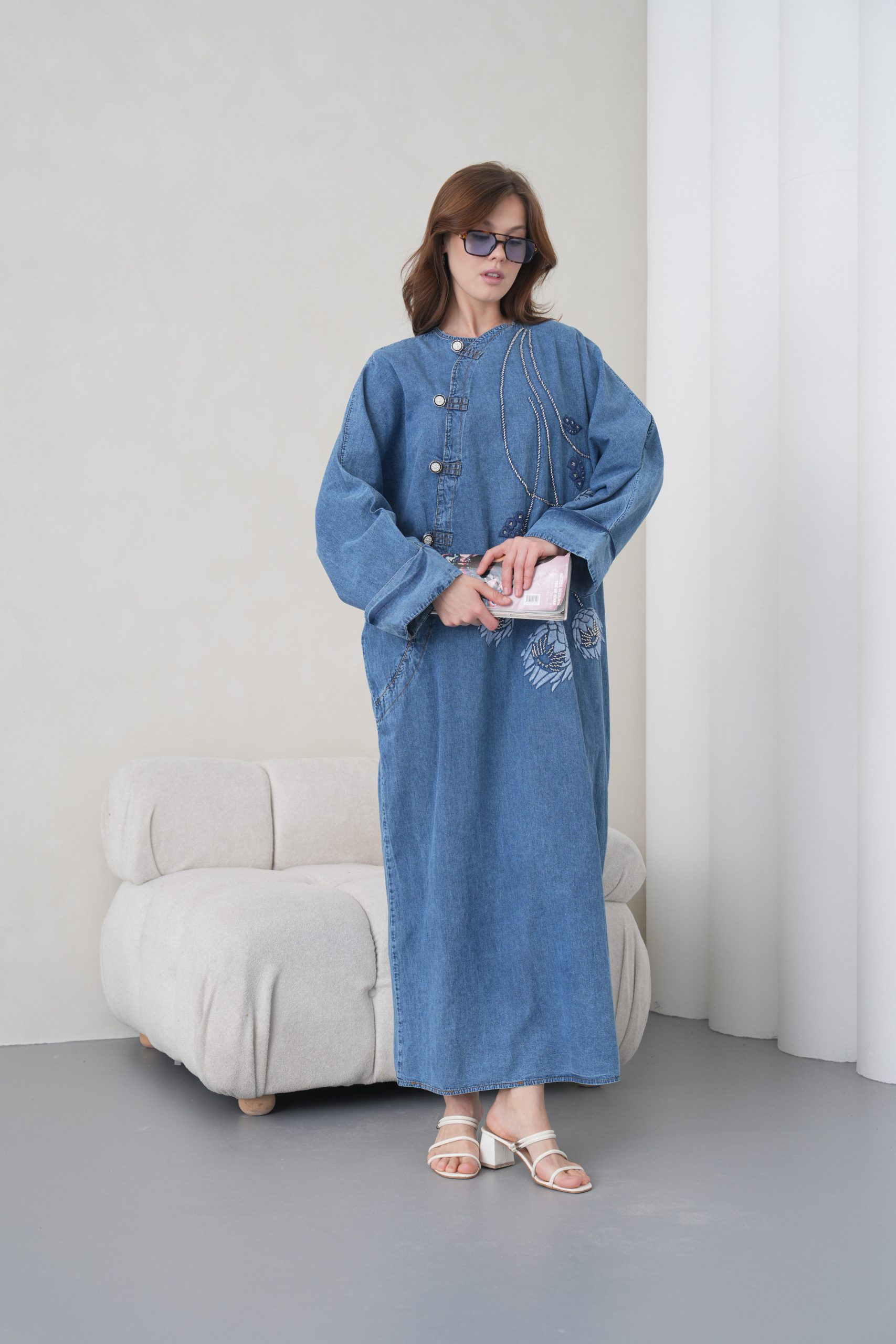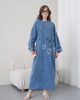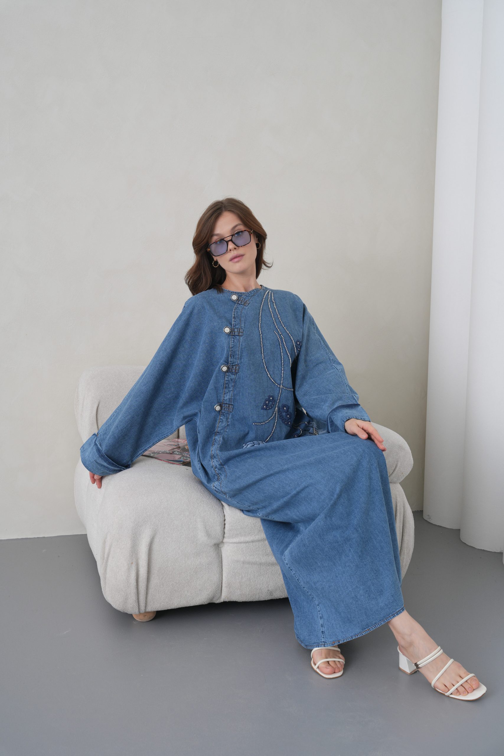 Denimin rahatlığını zanaatkar dokunuşlarla bir araya getiren bu özel tasarım, muhafazakar giyimin modern yüzünü yansıtıyor. Elora kalitesiyle özenle hazırlanan bu elbise, gün boyu süren konforu zarif nakış detaylarıyla taçlandırarak stilinize sofistike bir imza atıyor.
