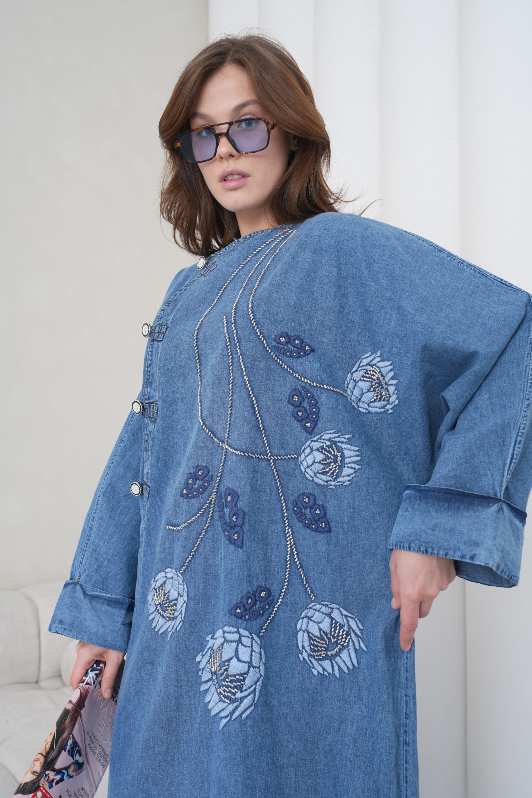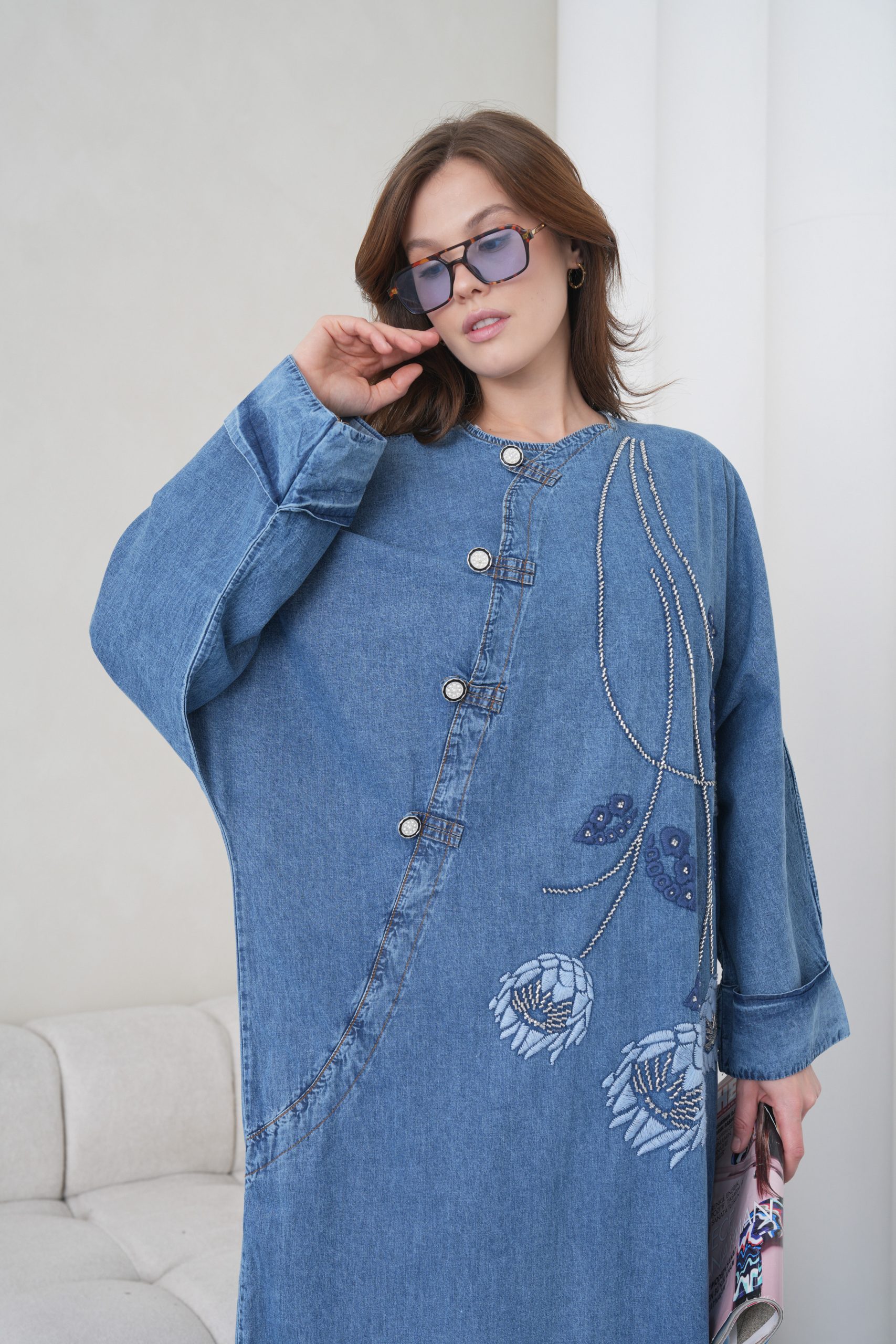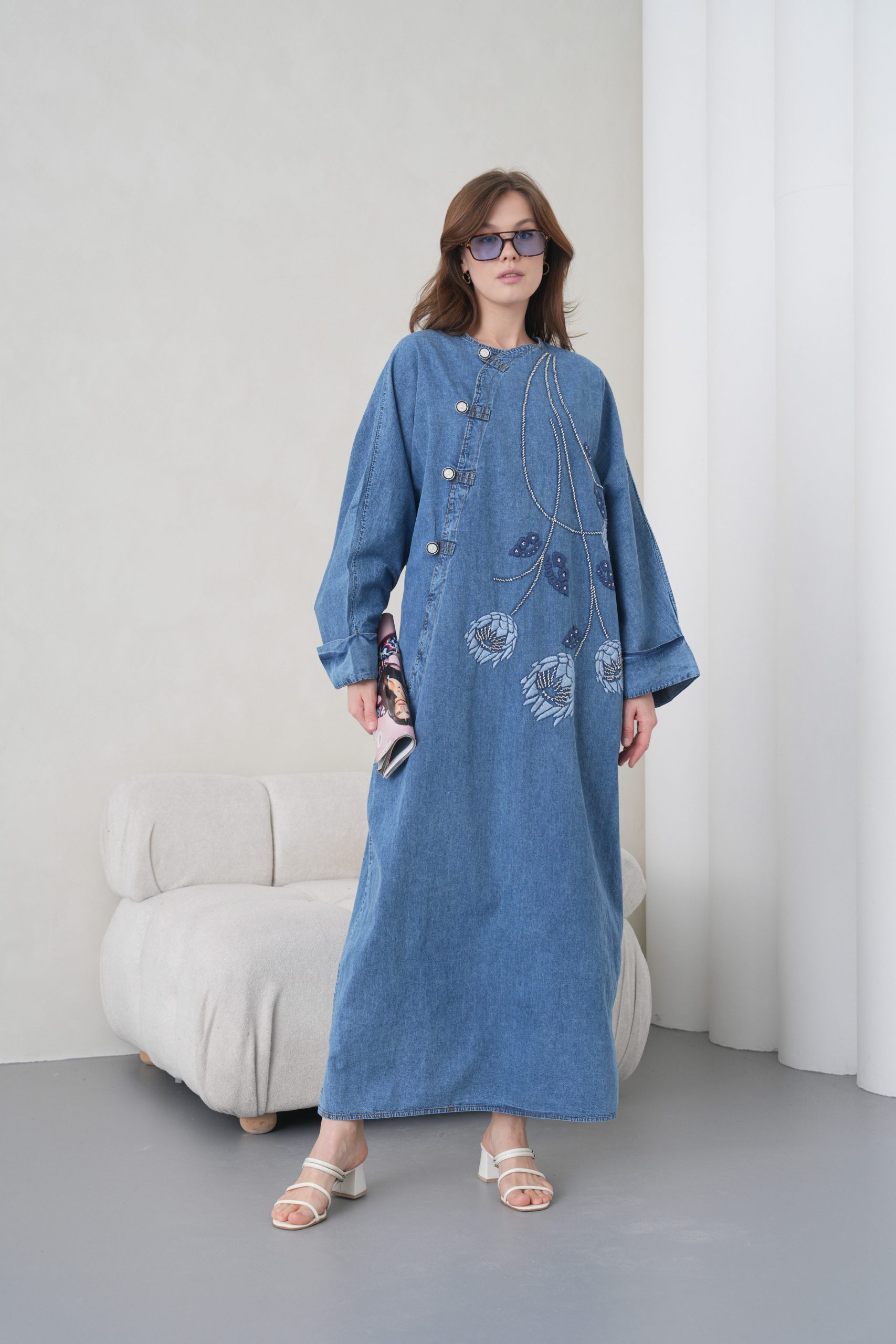 Boncuk Ve Nakış İşlemeli Geniş Kalıp Uzun Kot Elbise