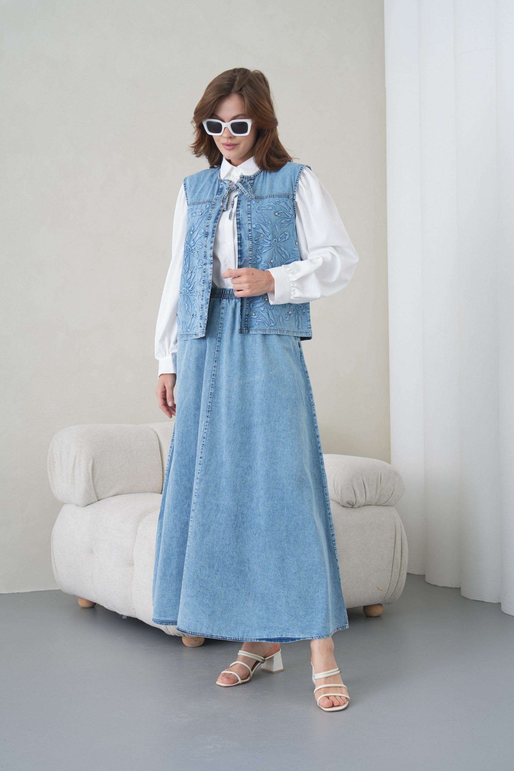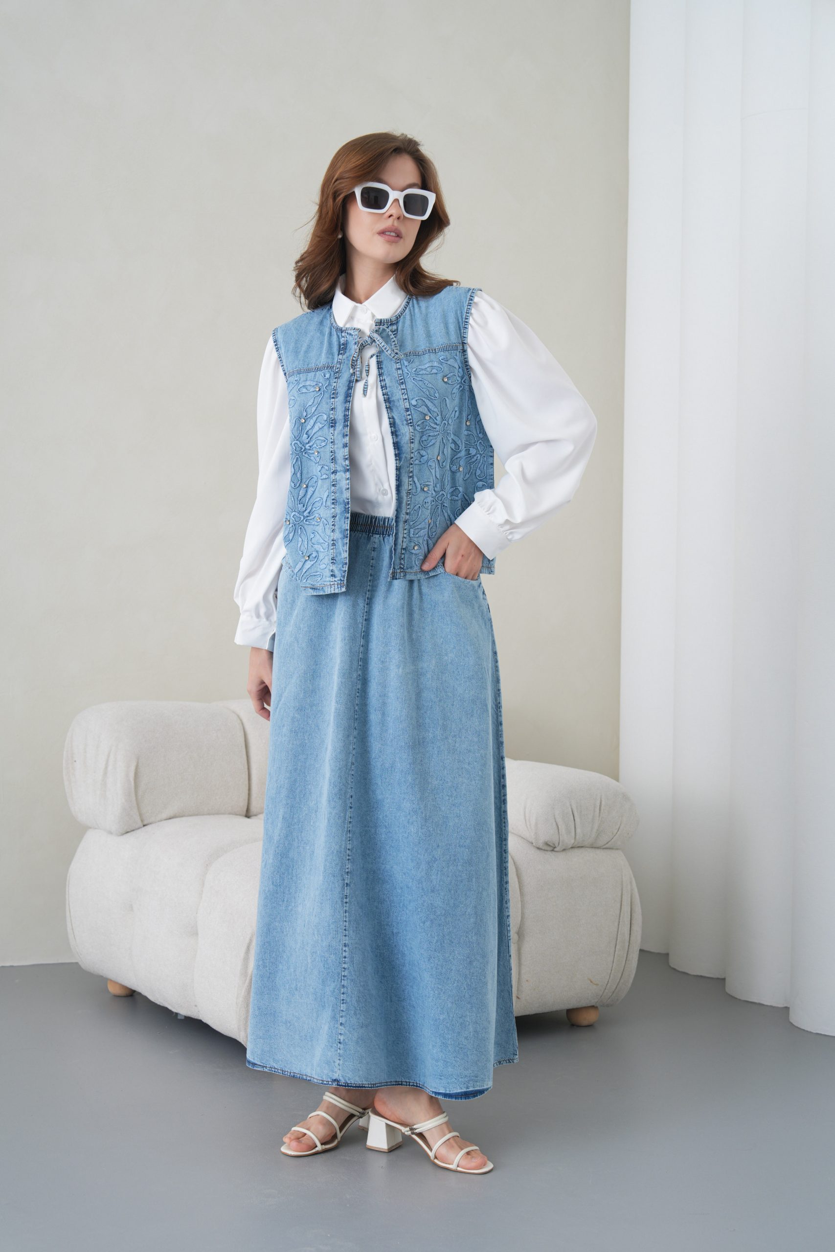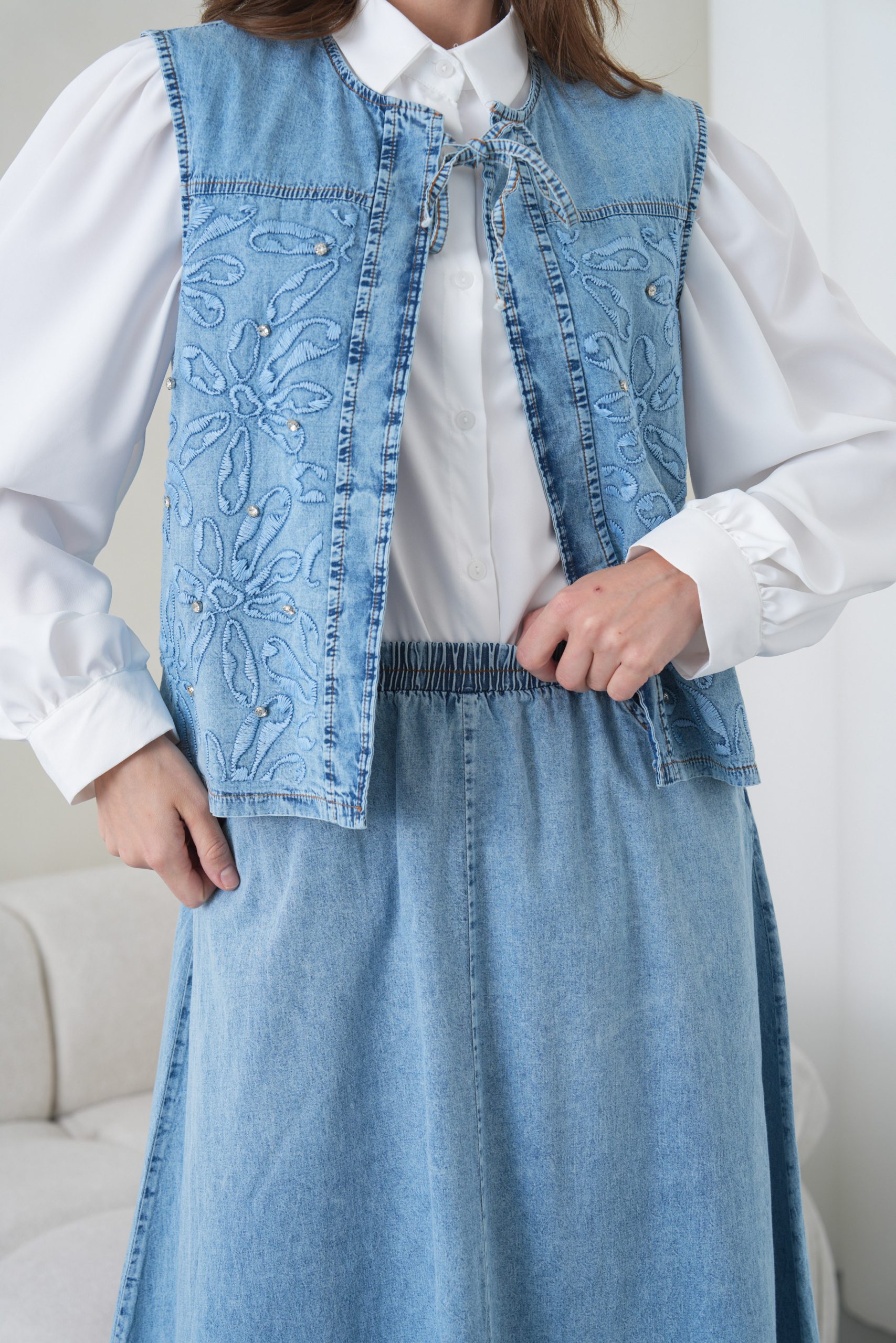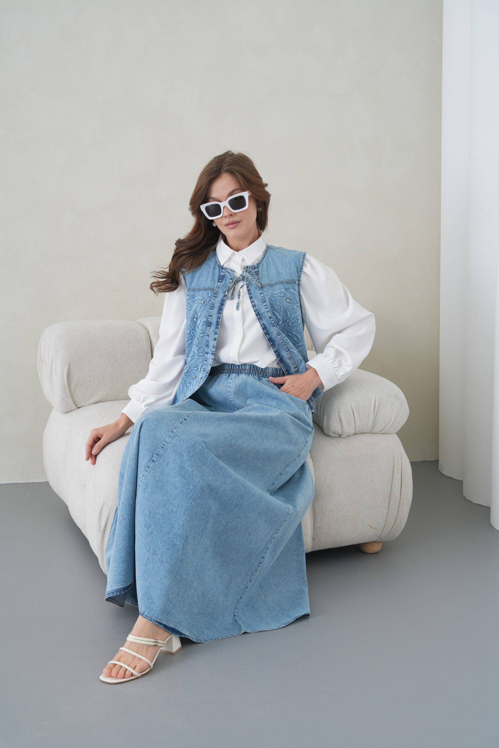 Denimin rahatlığını zanaatkar dokunuşlarla bir araya getiren bu özel tasarım, muhafazakar giyimin modern yüzünü yansıtıyor. Elora kalitesiyle özenle hazırlanan bu takım, gün boyu süren konforu zarif nakış detaylarıyla taçlandırarak stilinize sofistike bir imza atıyor.