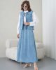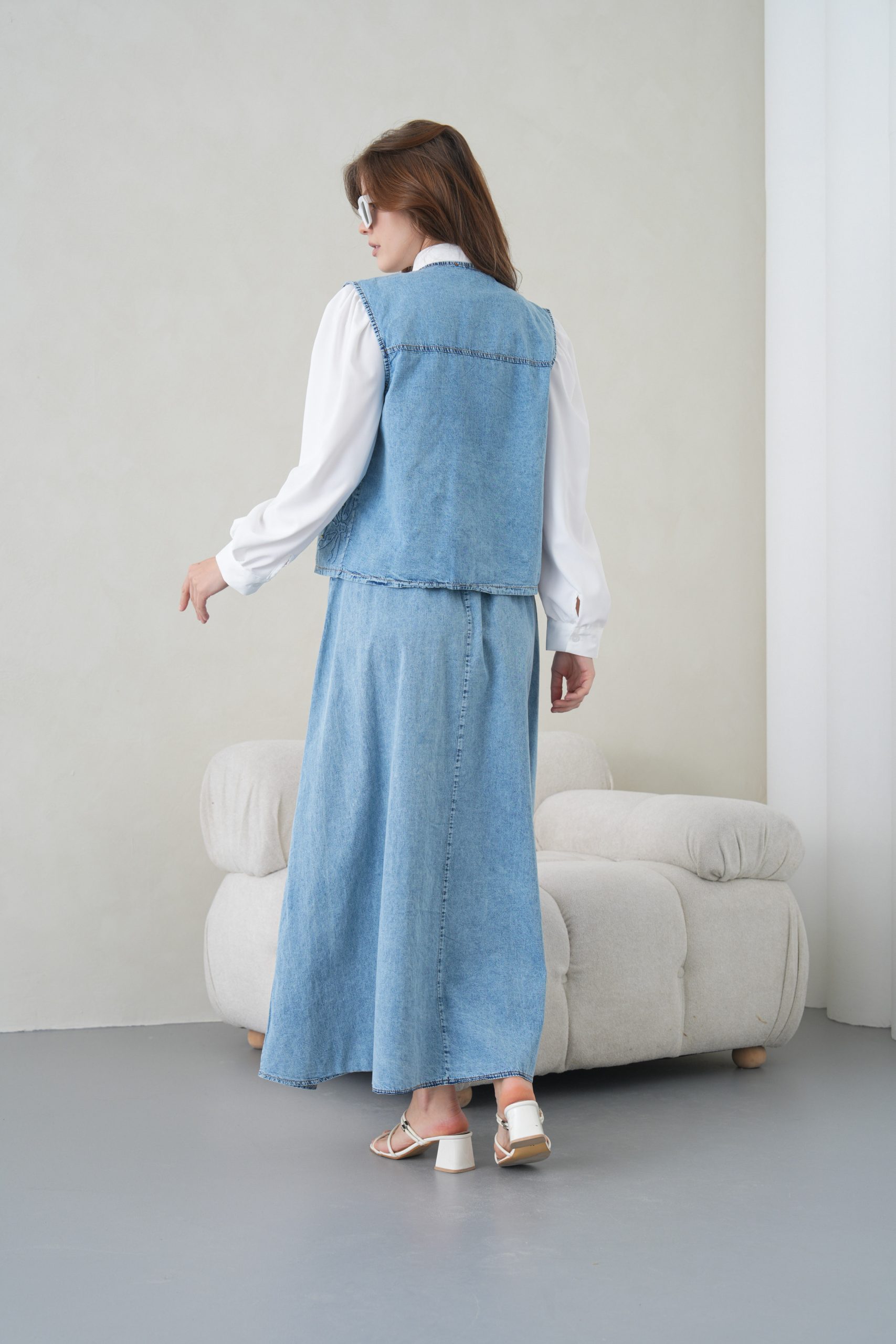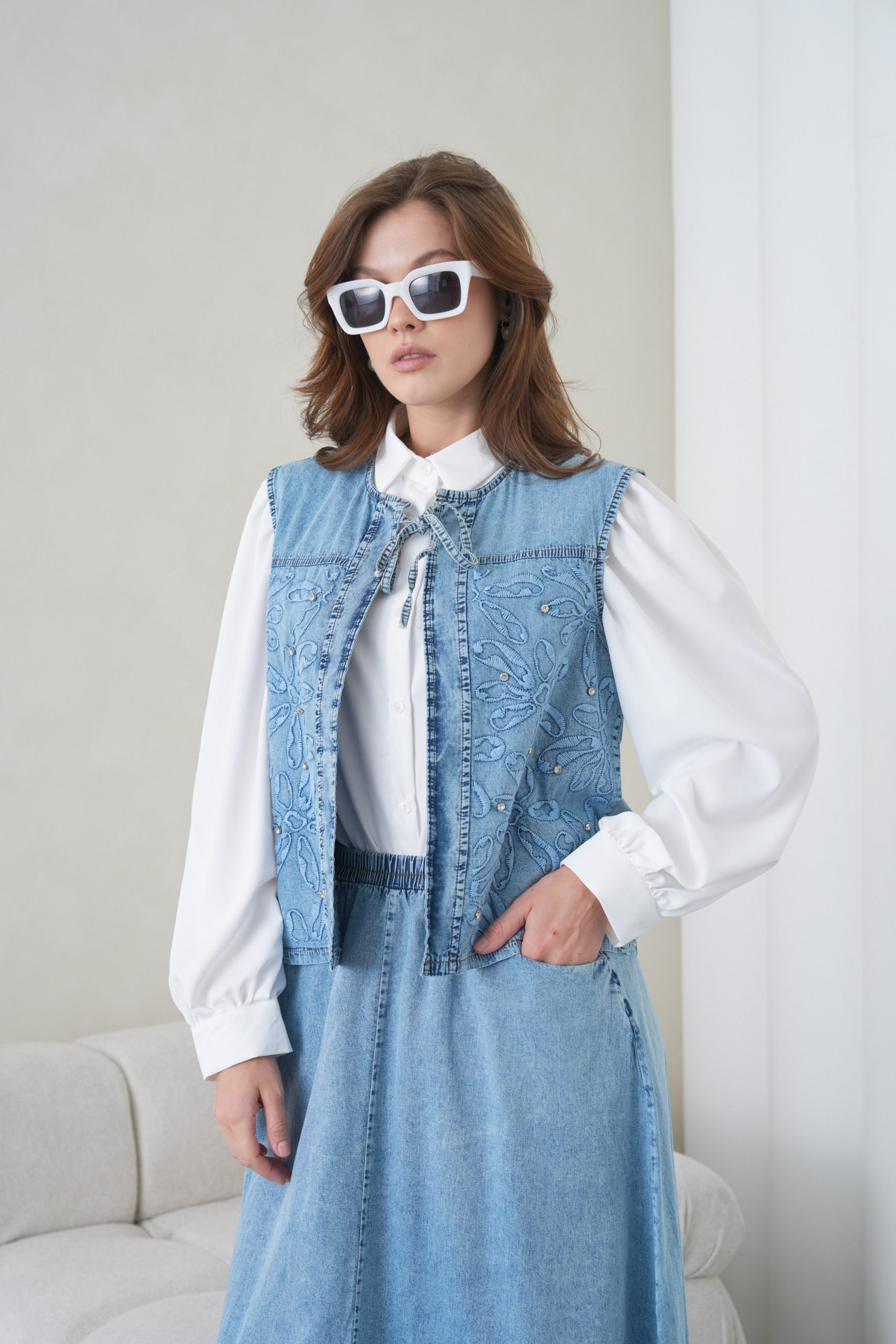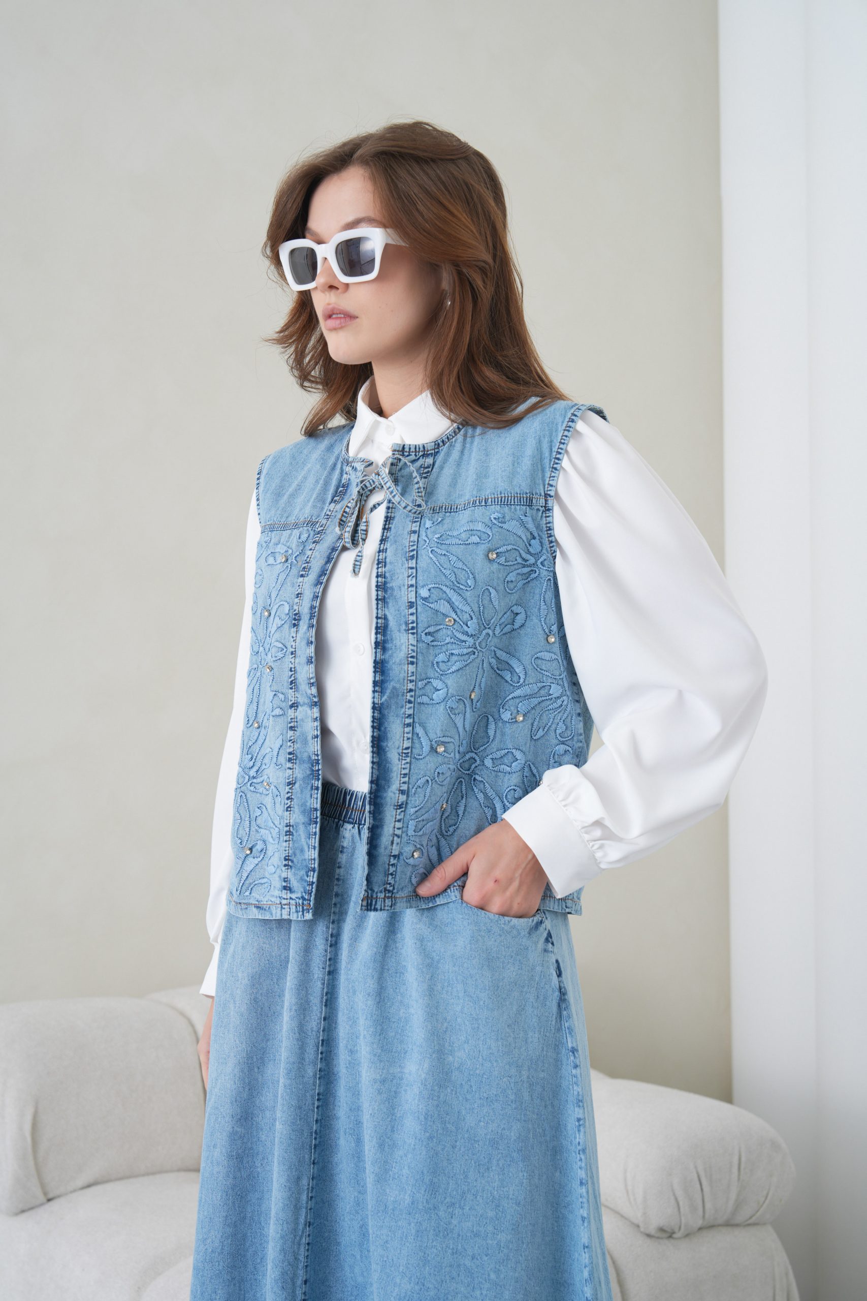 Denimin rahatlığını zanaatkar dokunuşlarla bir araya getiren bu özel tasarım, muhafazakar giyimin modern yüzünü yansıtıyor. Elora kalitesiyle özenle hazırlanan bu takım, gün boyu süren konforu zarif nakış detaylarıyla taçlandırarak stilinize sofistike bir imza atıyor.