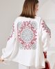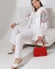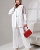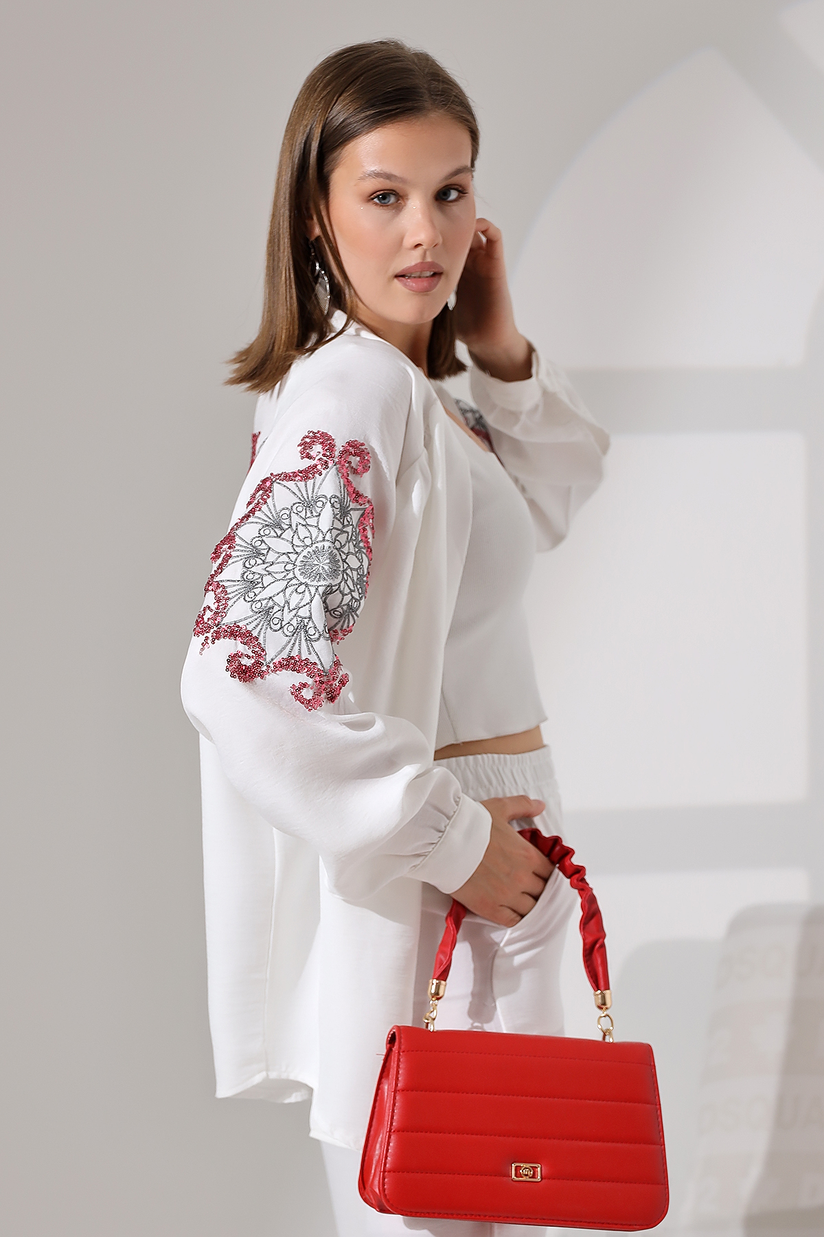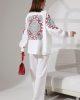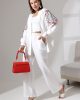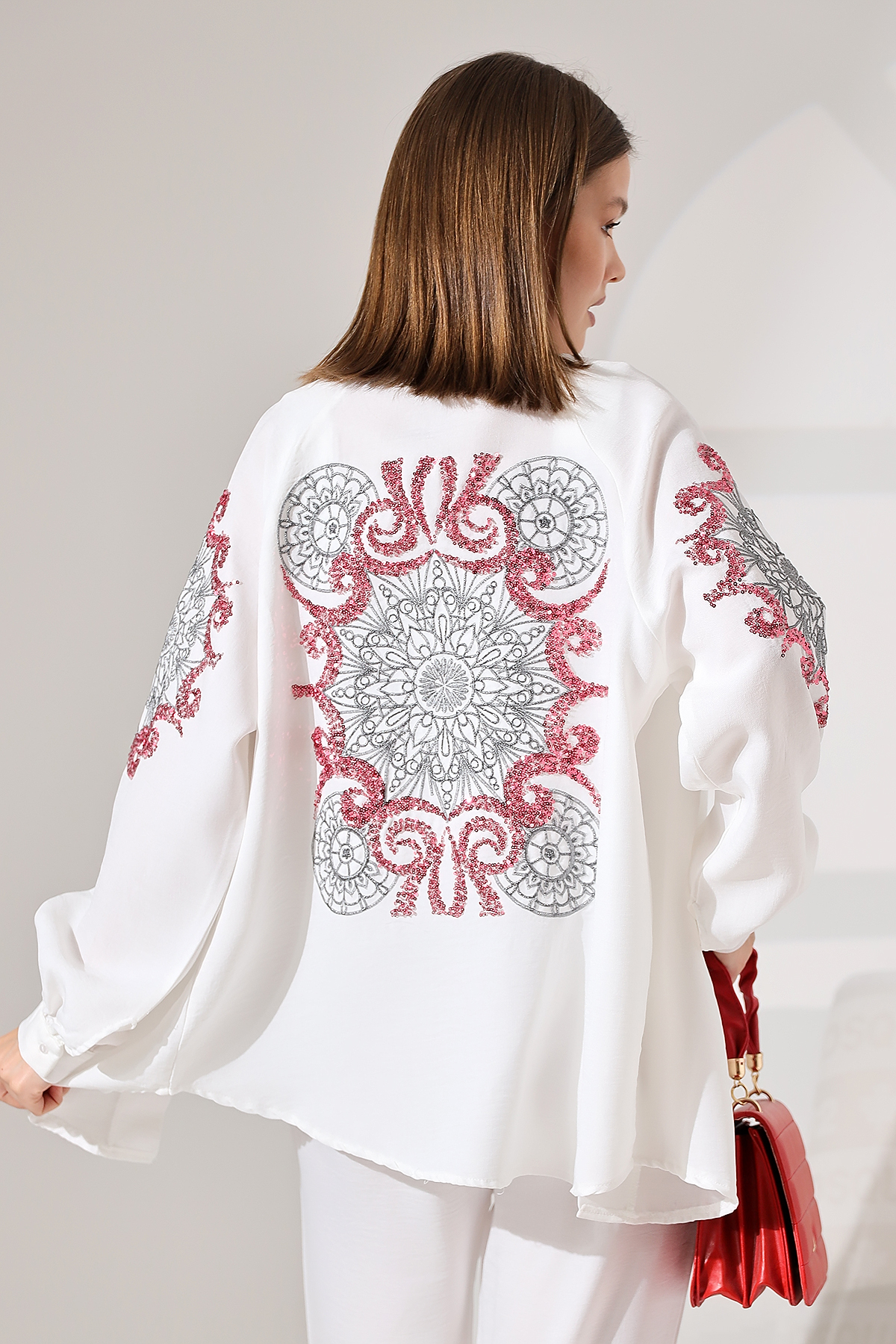Göz Alıcı İşlemeler: Keten gömlek takımın ön yüzeyinde merkezden aşağıya doğru süzülen floral nakışlar ve kıvrımlı boncuk işlemeleri, tasarıma sanatsal ve lüks bir derinlik katar.