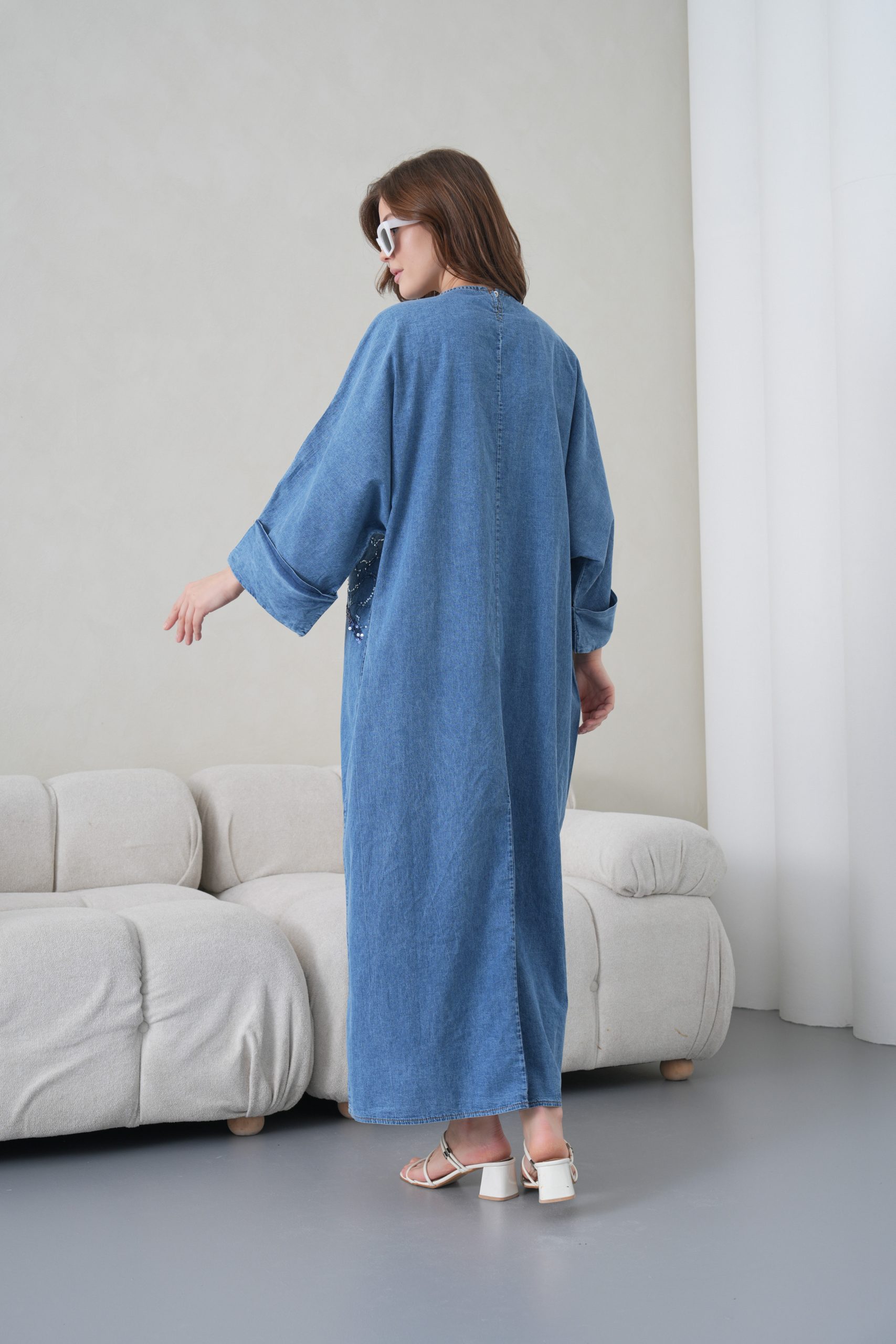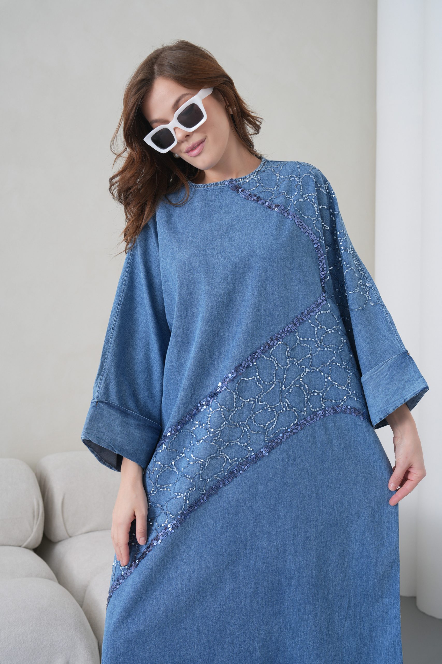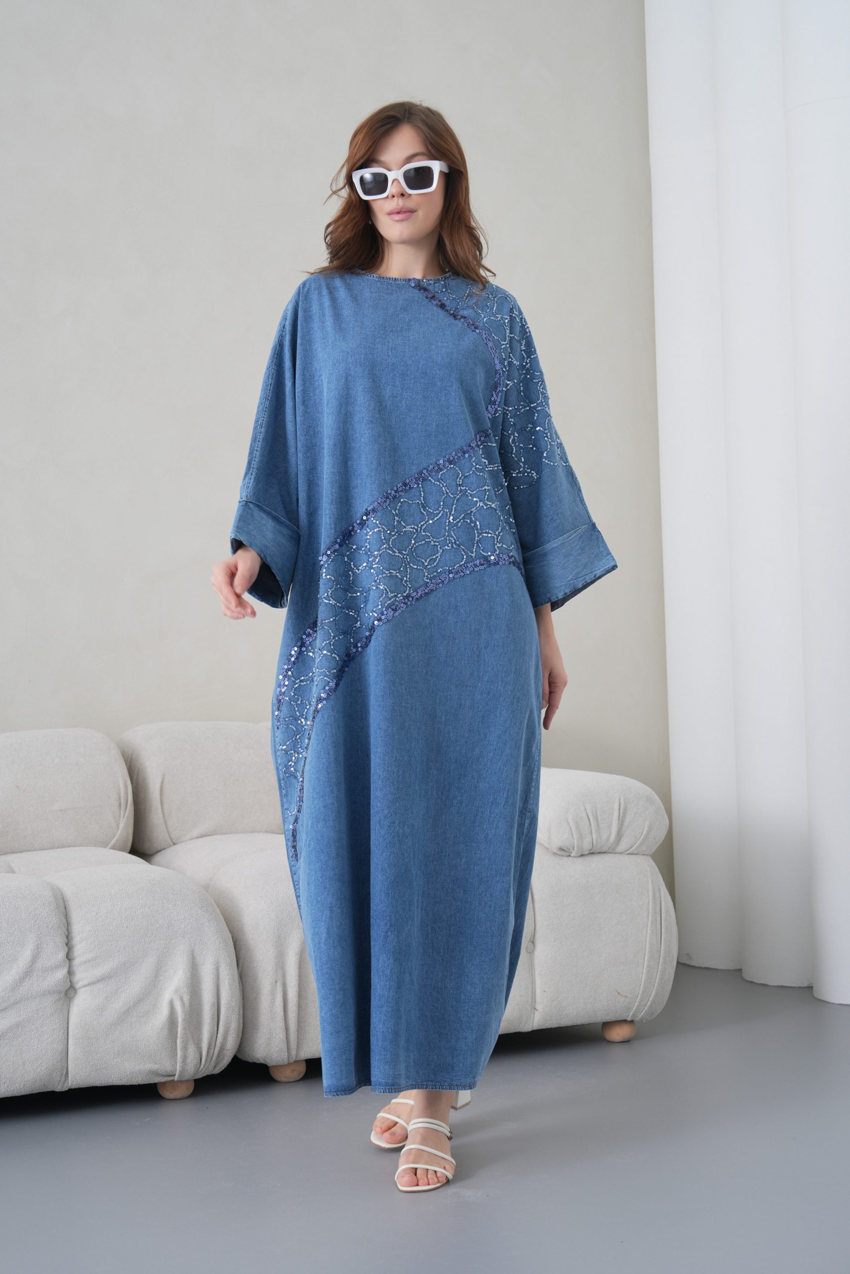 Zarif Detaylar: Elbisenin ön gövdesinden omuz kısmına doğru uzanan asimetrik payet ve pul nakış işlemeleri, denim kumaşa modern ve lüks bir hava katmaktadır.
