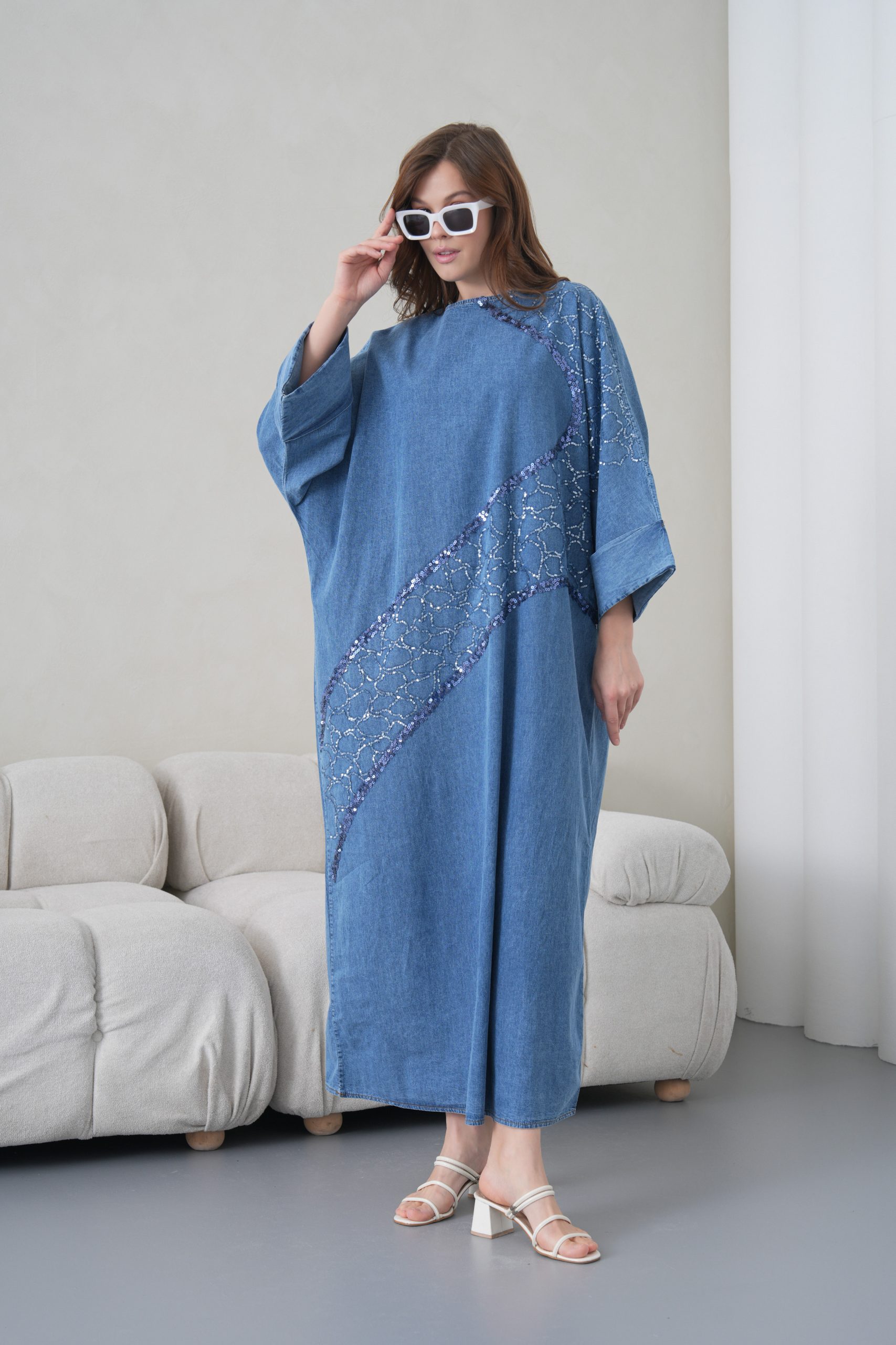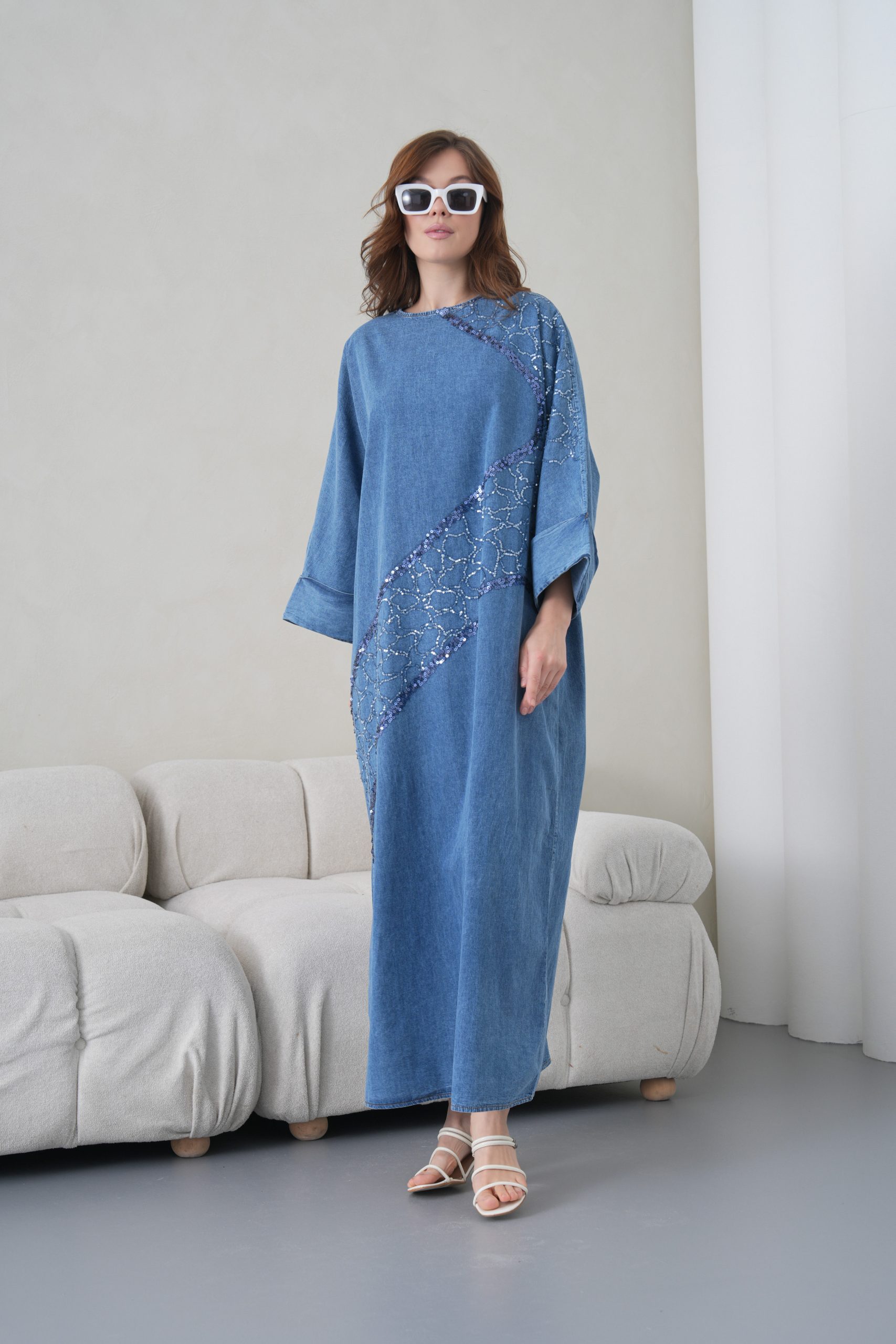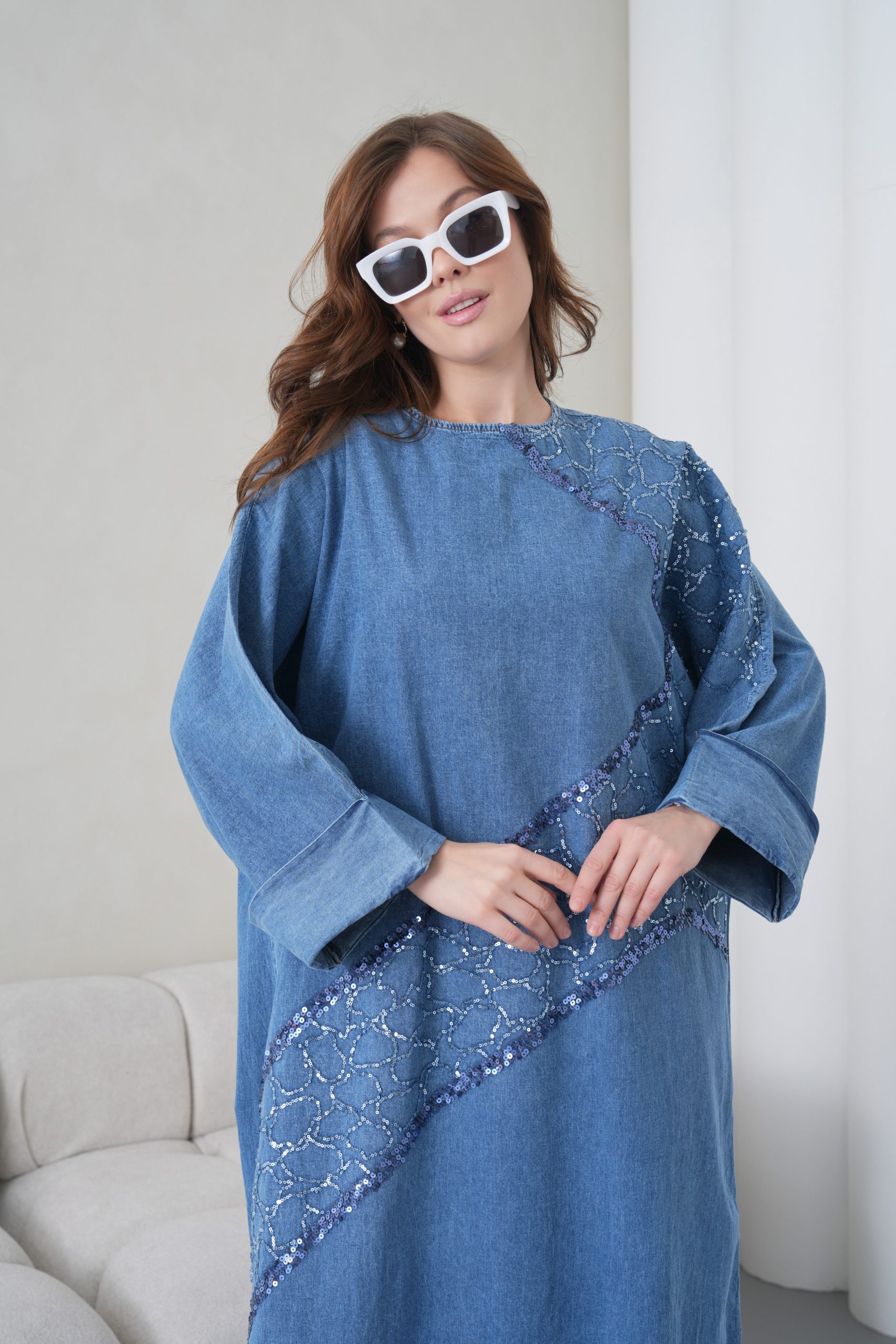 Zarif Detaylar: Elbisenin ön gövdesinden omuz kısmına doğru uzanan asimetrik payet ve pul nakış işlemeleri, denim kumaşa modern ve lüks bir hava katmaktadır.