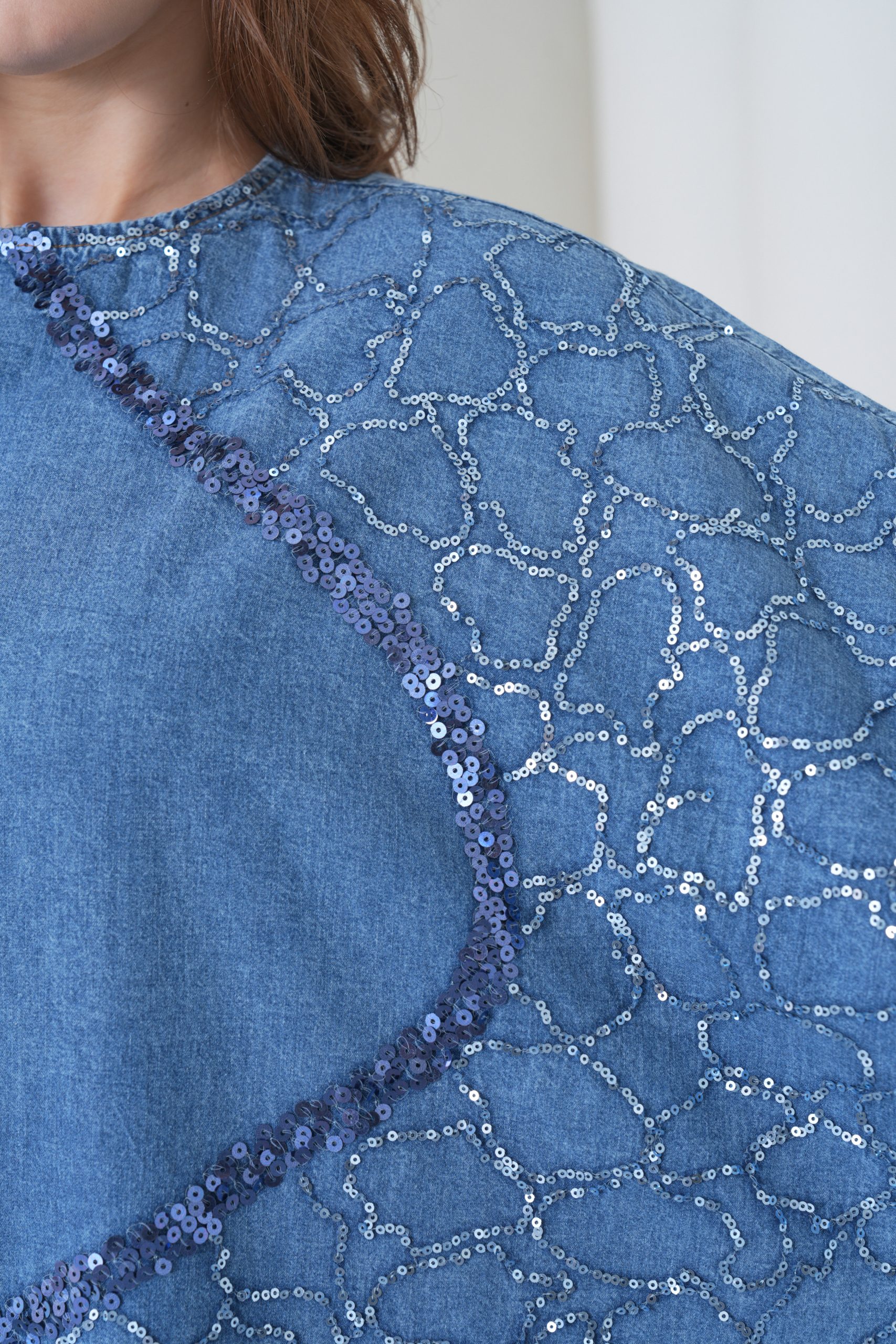 Denimin zamansız tavrını, ışıltılı detaylarla buluşturan bu özel tasarım; konfor ve şıklığı bir arada sunuyor. Geniş kalıbı (oversize) sayesinde özgür hareket alanı sağlarken, üzerindeki asimetrik işleme detaylarıyla stilinize sanatsal bir dokunuş katıyor.