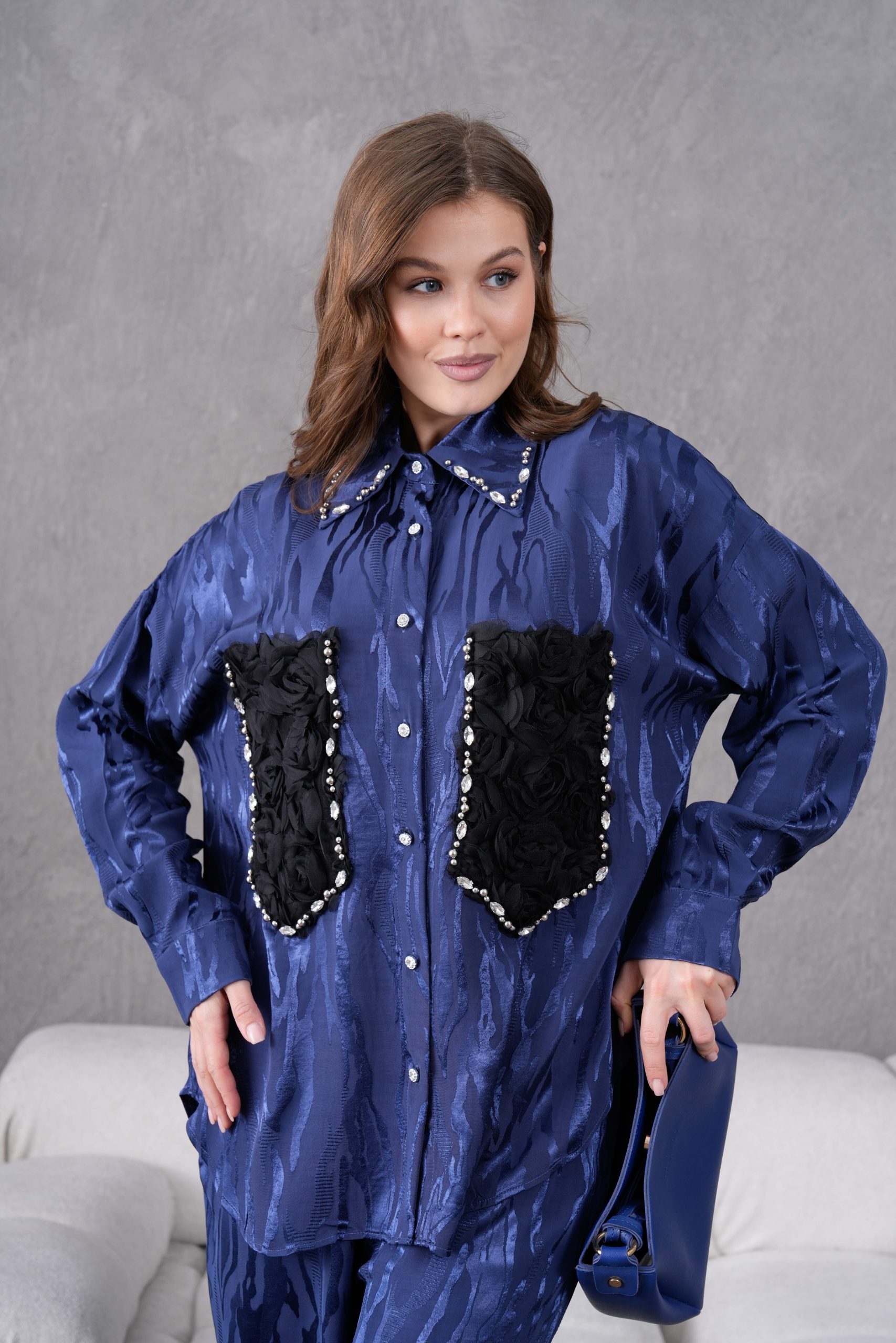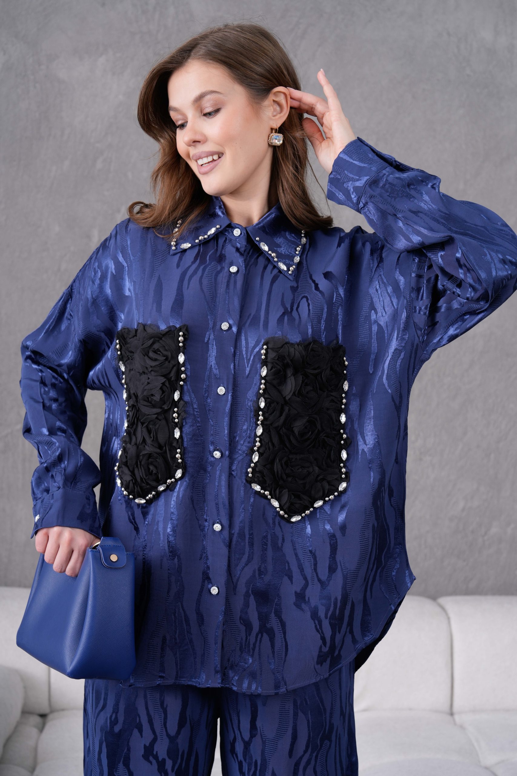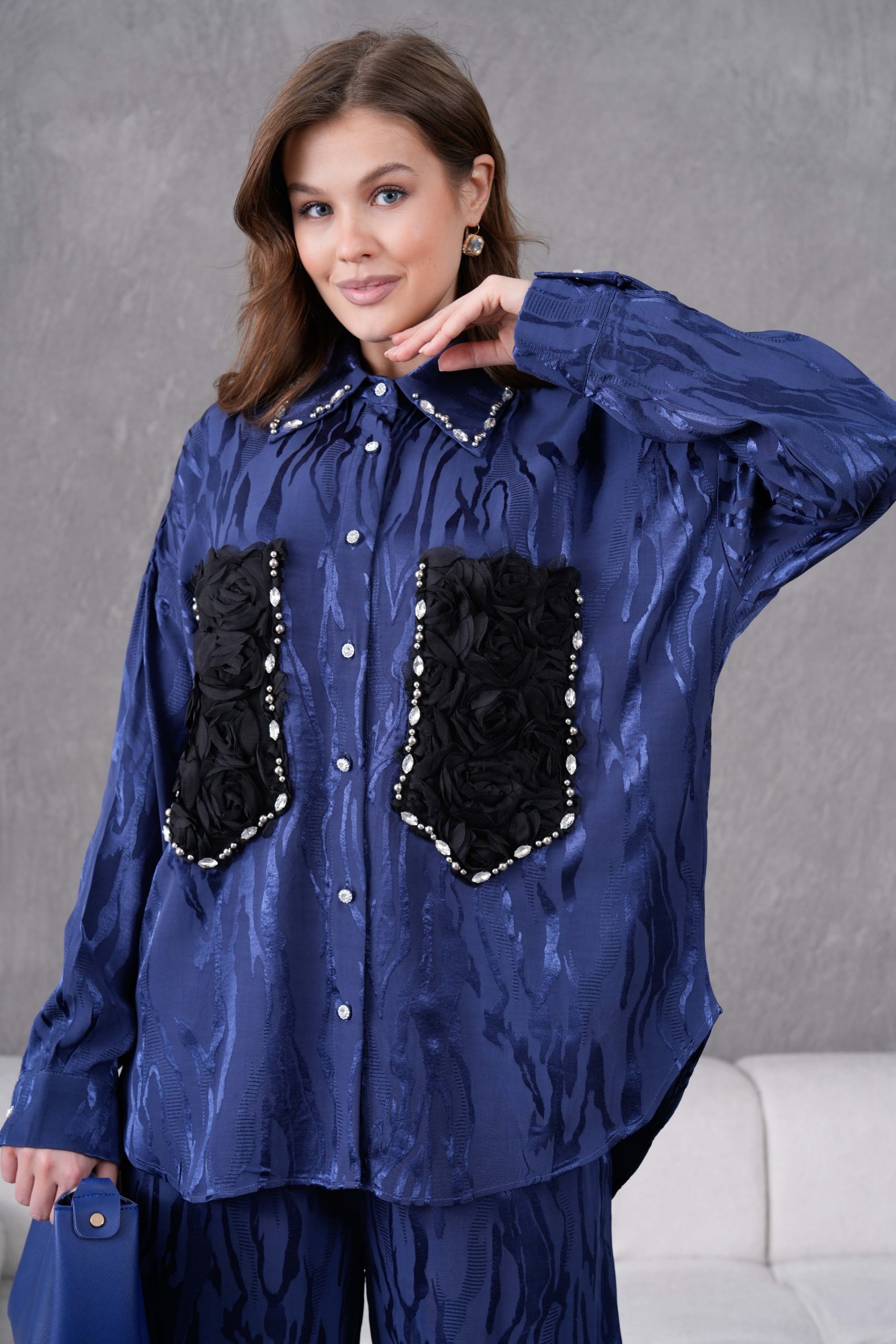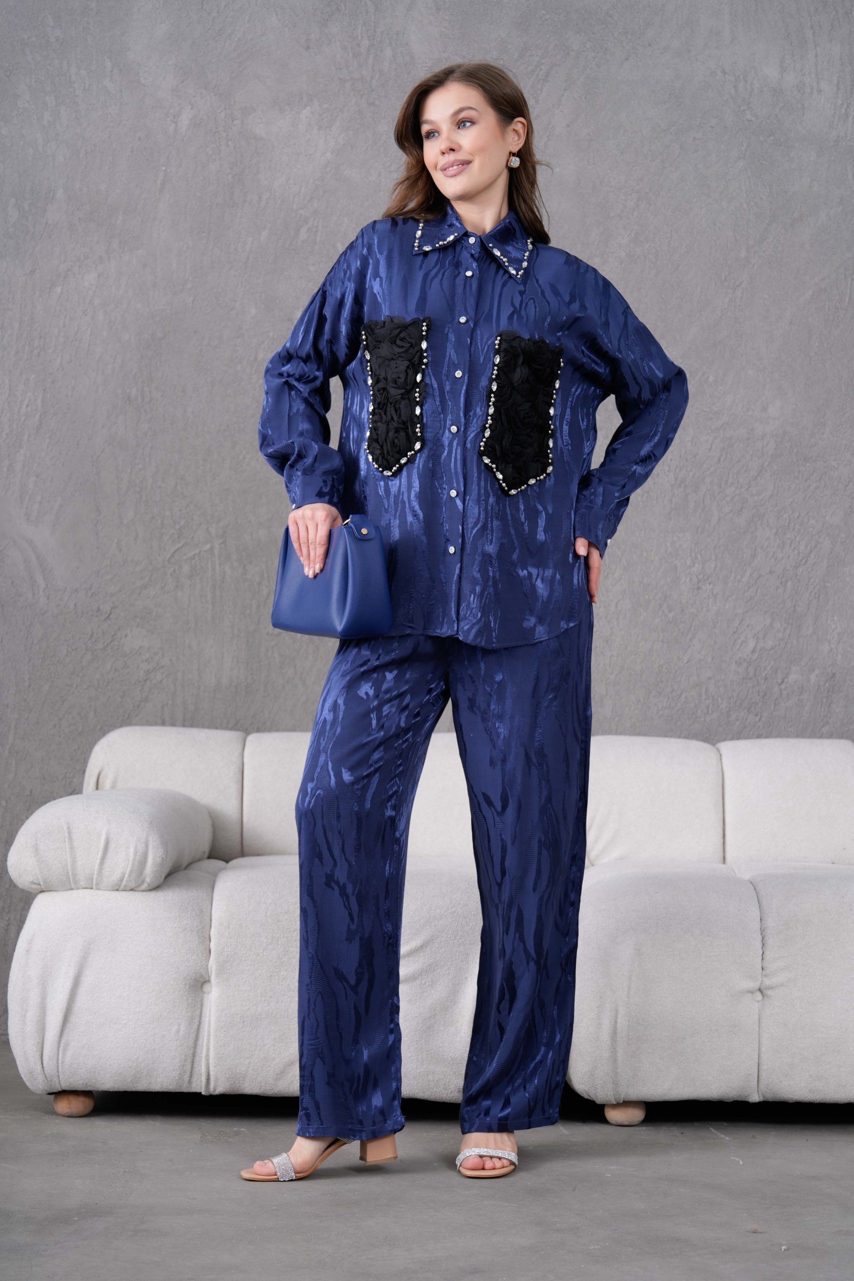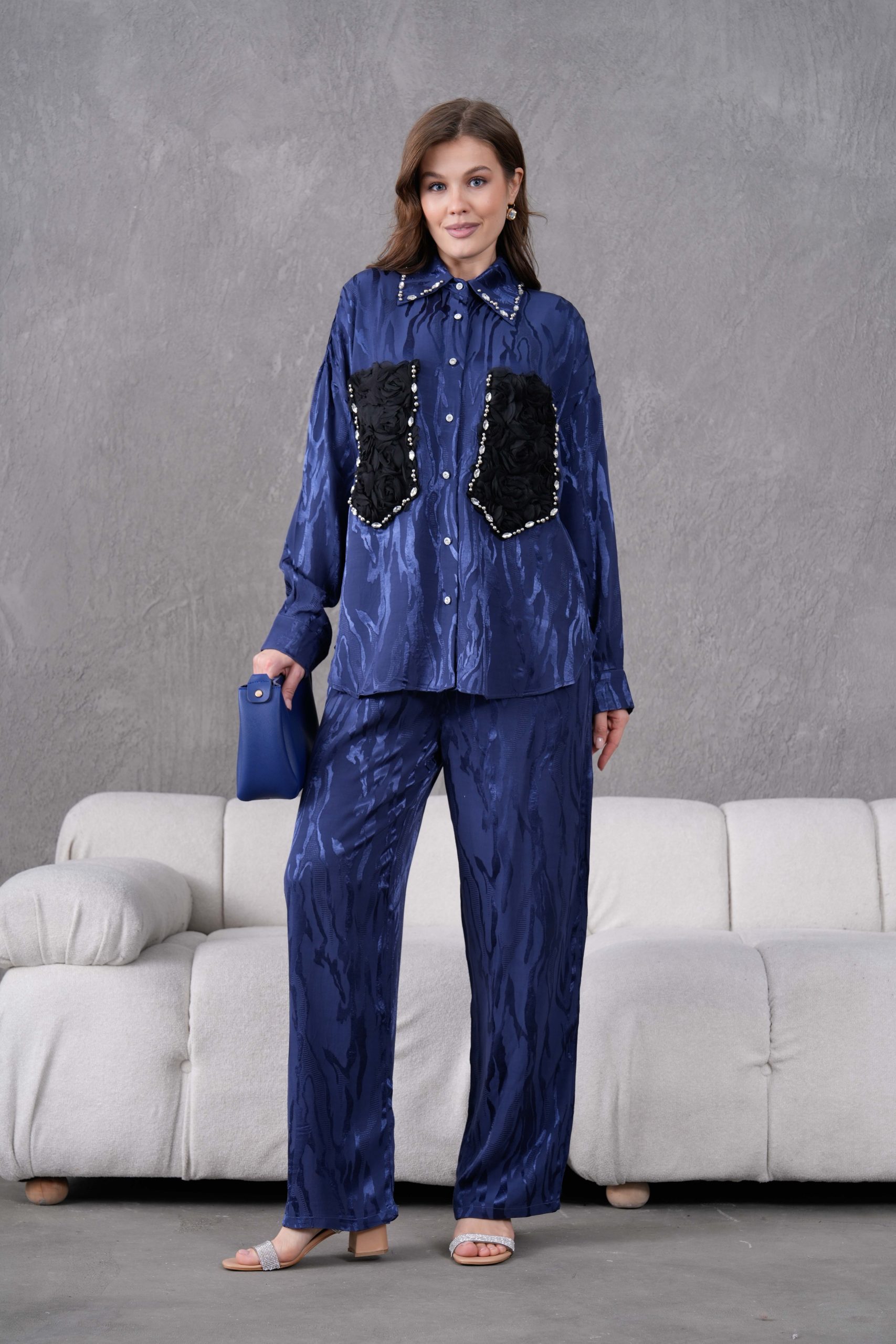 Taş İşlemeli Büyük Cepli Jakar Gömlek Ve Pantolon Takım