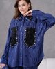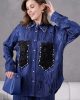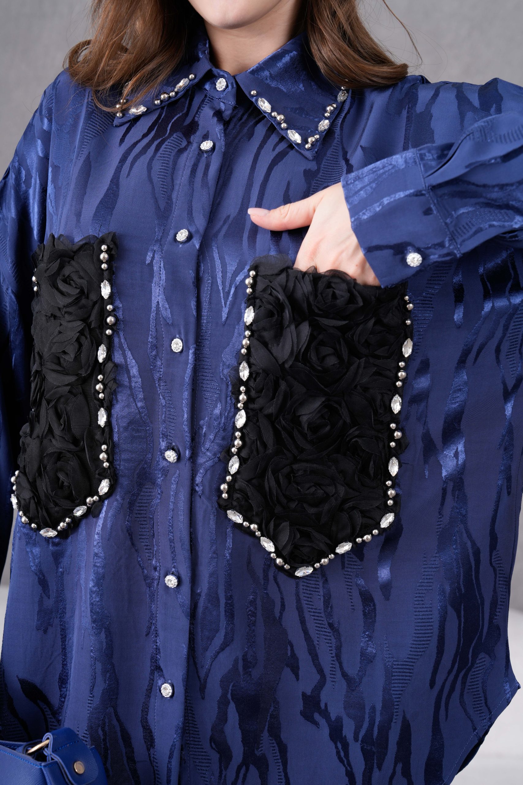 Göz Alıcı Cep Detayları: Gömleğin ön kısmında yer alan siyah renkli 3D (üç boyutlu) gül formundaki cepler, etrafını saran parlak kristal taş işlemelerle muazzam bir kontrast ve lüks bir görünüm yaratır.