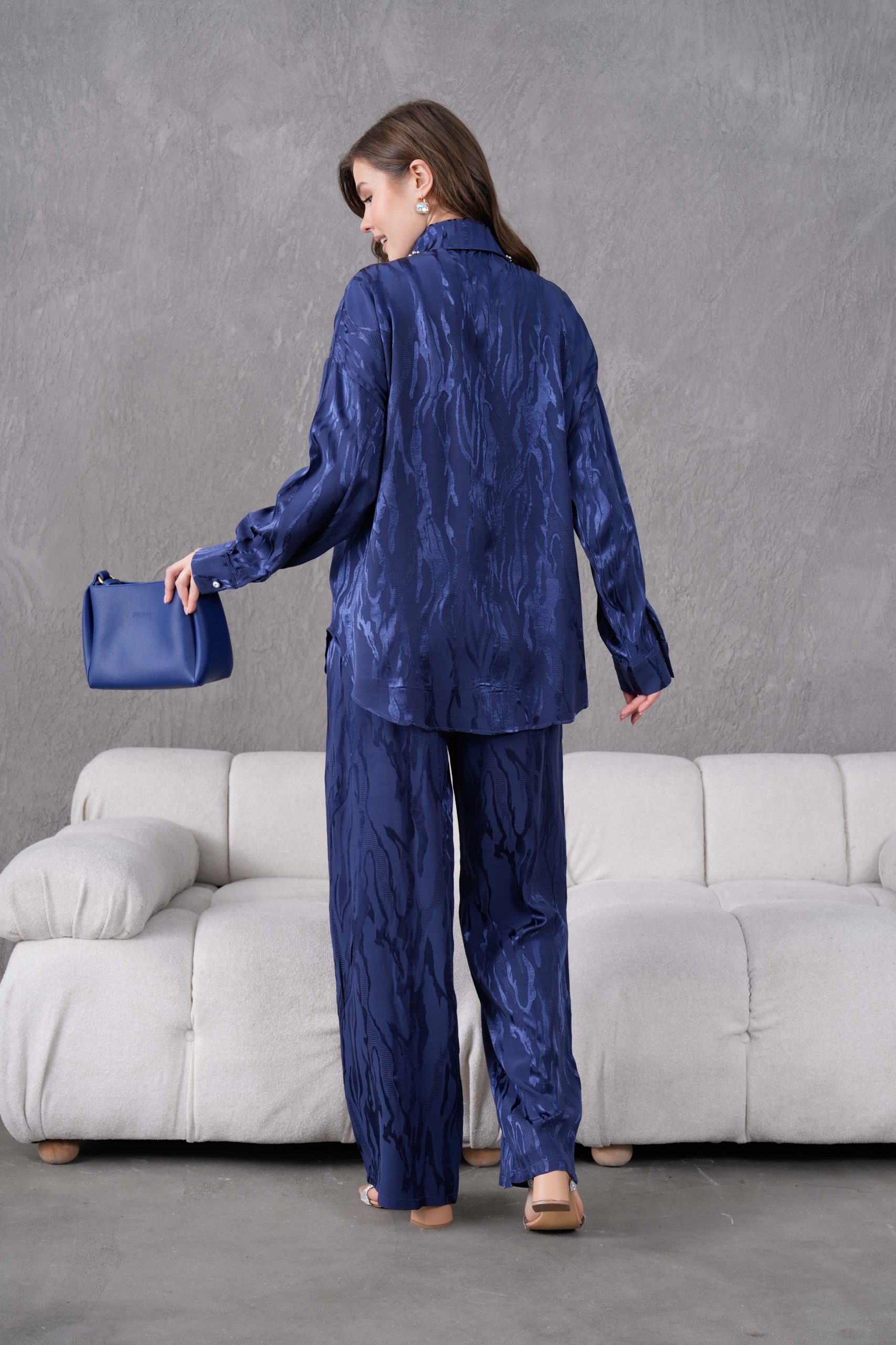 Kendinden desenli parlak dokusu ve göz alıcı detaylarıyla öne çıkan bu takım, Elora kadınının cesur ve zarif stilini yansıtıyor. Gündüzden geceye uzanan şıklık vadeden bu tasarım, lüks hissi veren kumaşı ve özel el işçiliği detaylarıyla gardırobunuzun en ikonik parçalarından biri olmaya aday.