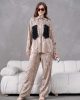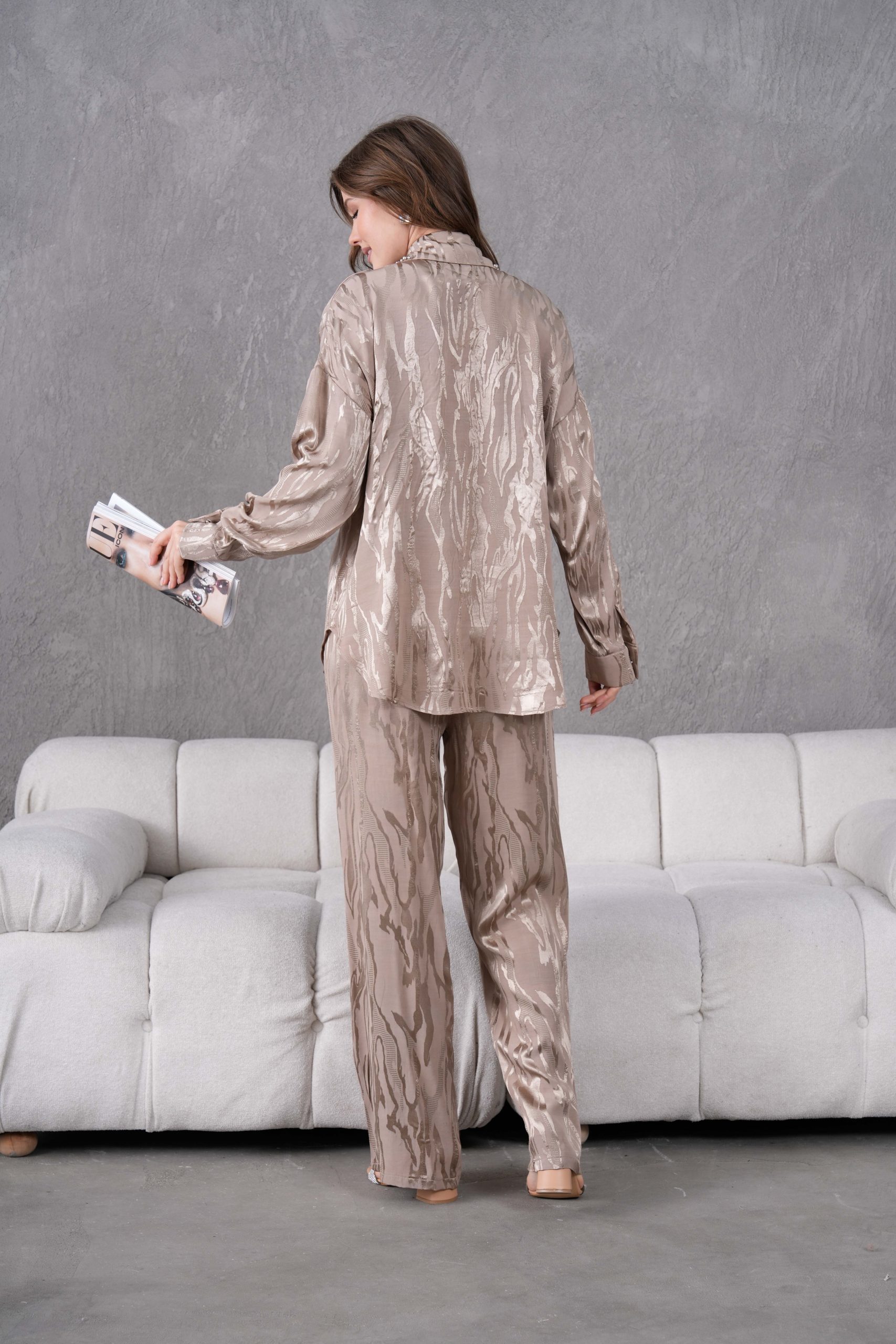 Kendinden desenli parlak dokusu ve göz alıcı detaylarıyla öne çıkan bu takım, Elora kadınının cesur ve zarif stilini yansıtıyor. Gündüzden geceye uzanan şıklık vadeden bu tasarım, lüks hissi veren kumaşı ve özel el işçiliği detaylarıyla gardırobunuzun en ikonik parçalarından biri olmaya aday.