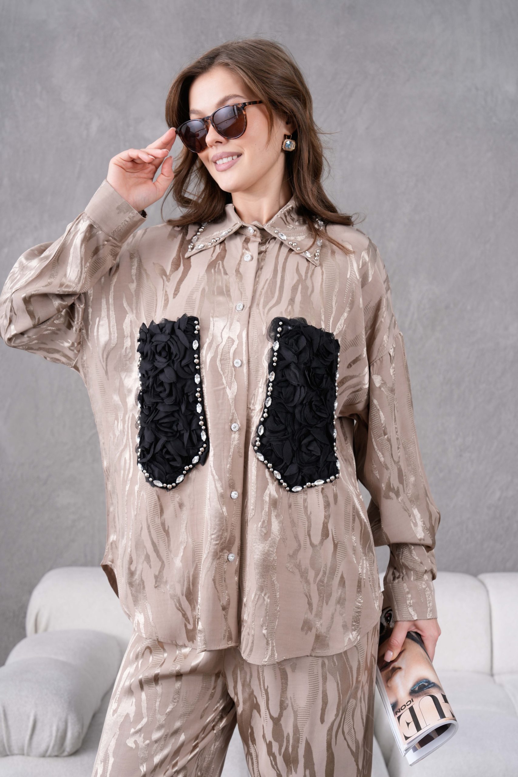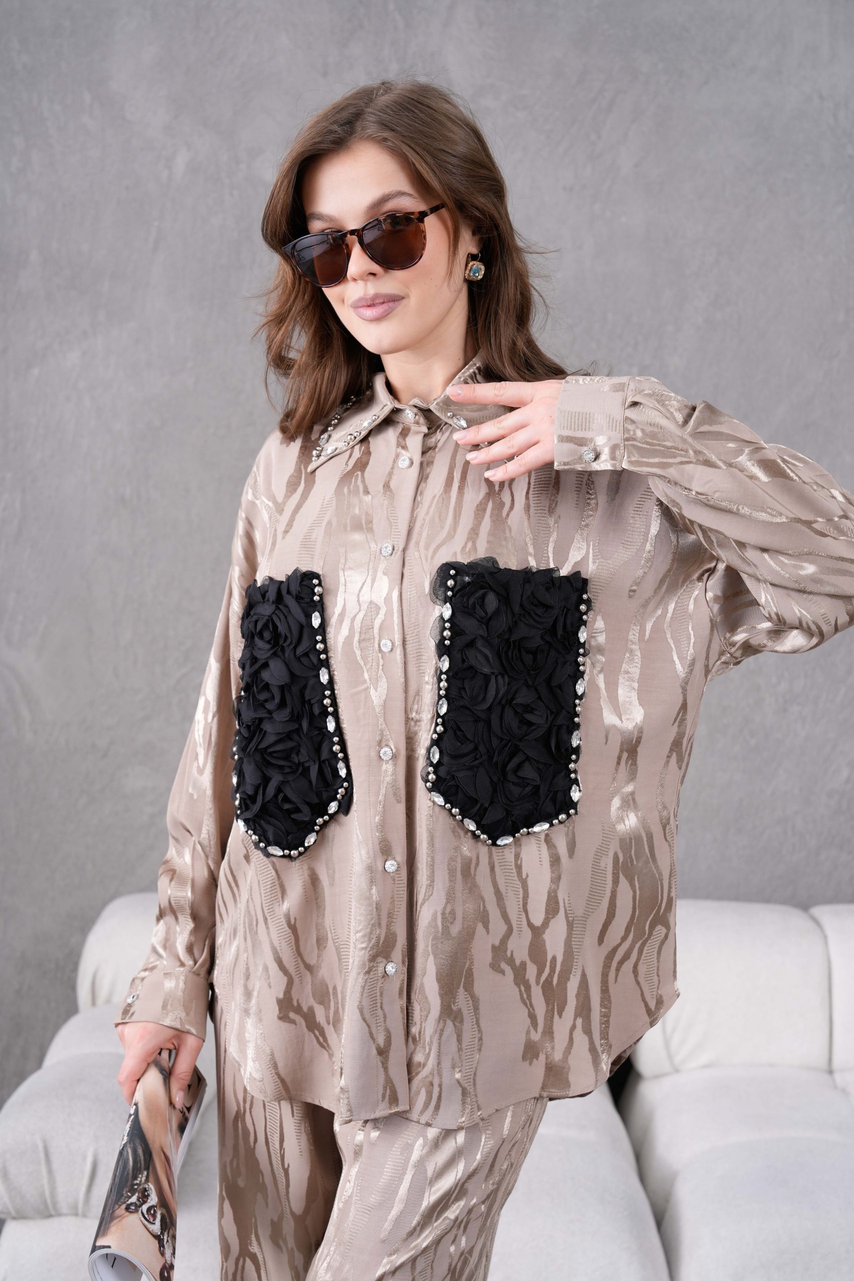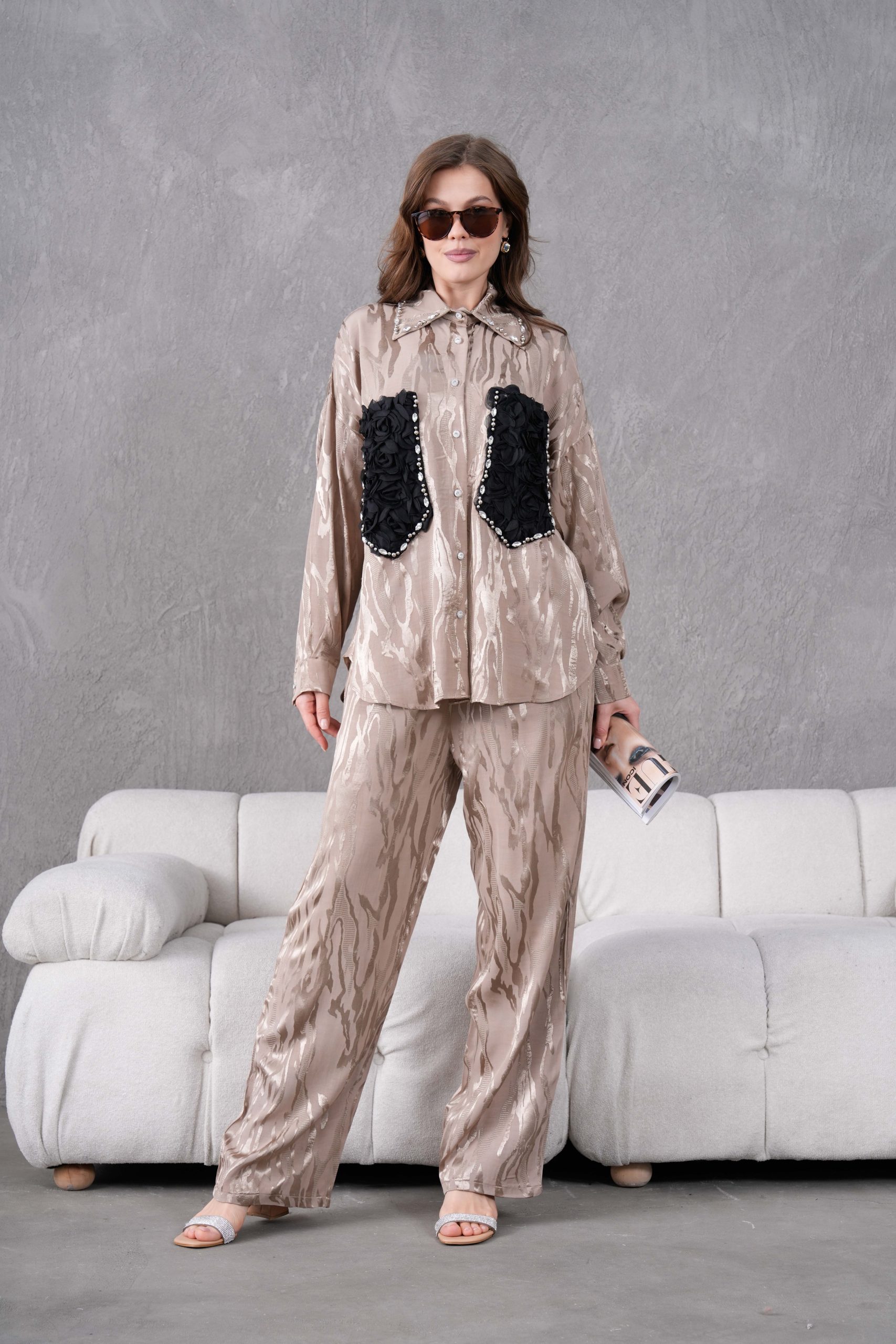Taş İşlemeli Büyük Cepli Jakar Gömlek Ve Pantolon Takım