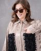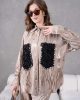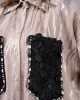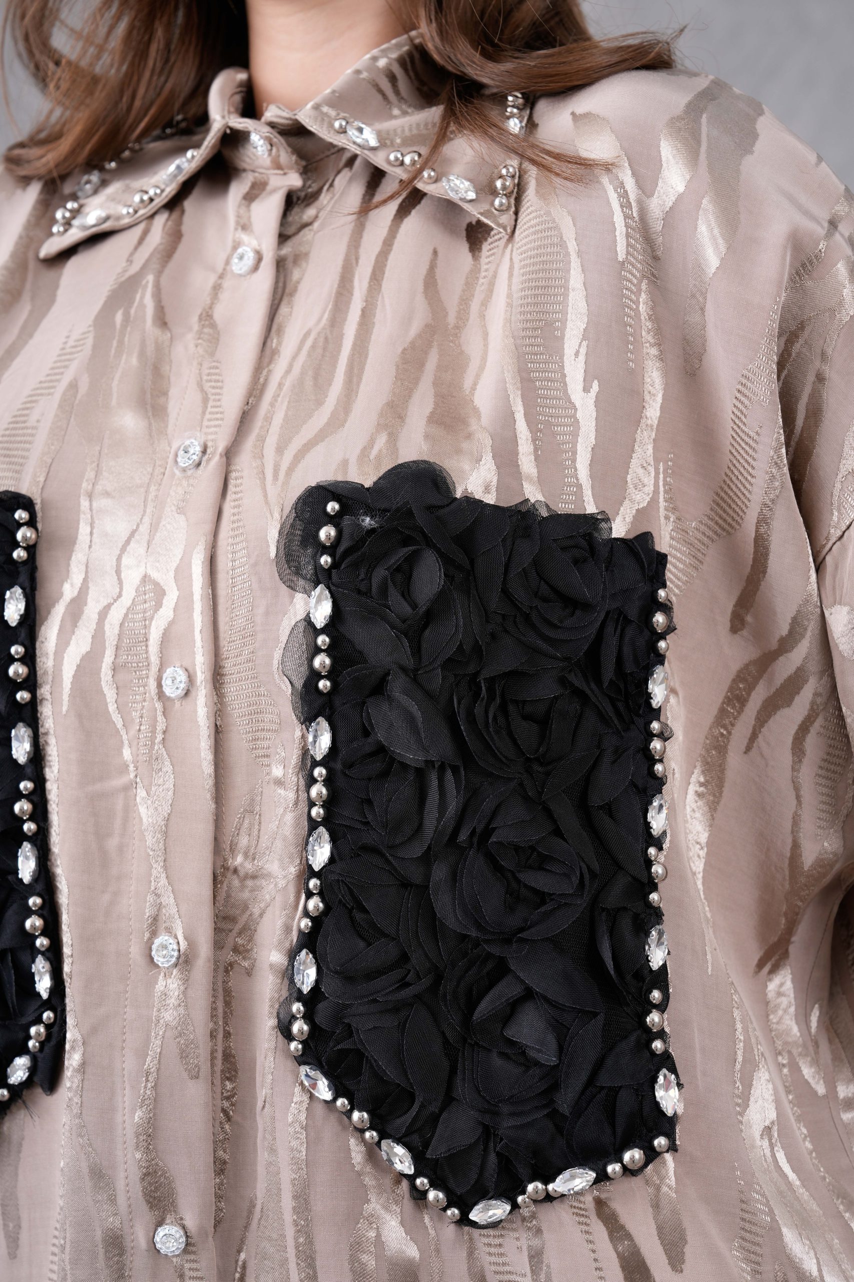 Göz Alıcı Cep Detayları: Gömleğin ön kısmında yer alan siyah renkli 3D (üç boyutlu) gül formundaki cepler, etrafını saran parlak kristal taş işlemelerle muazzam bir kontrast ve lüks bir görünüm yaratır.